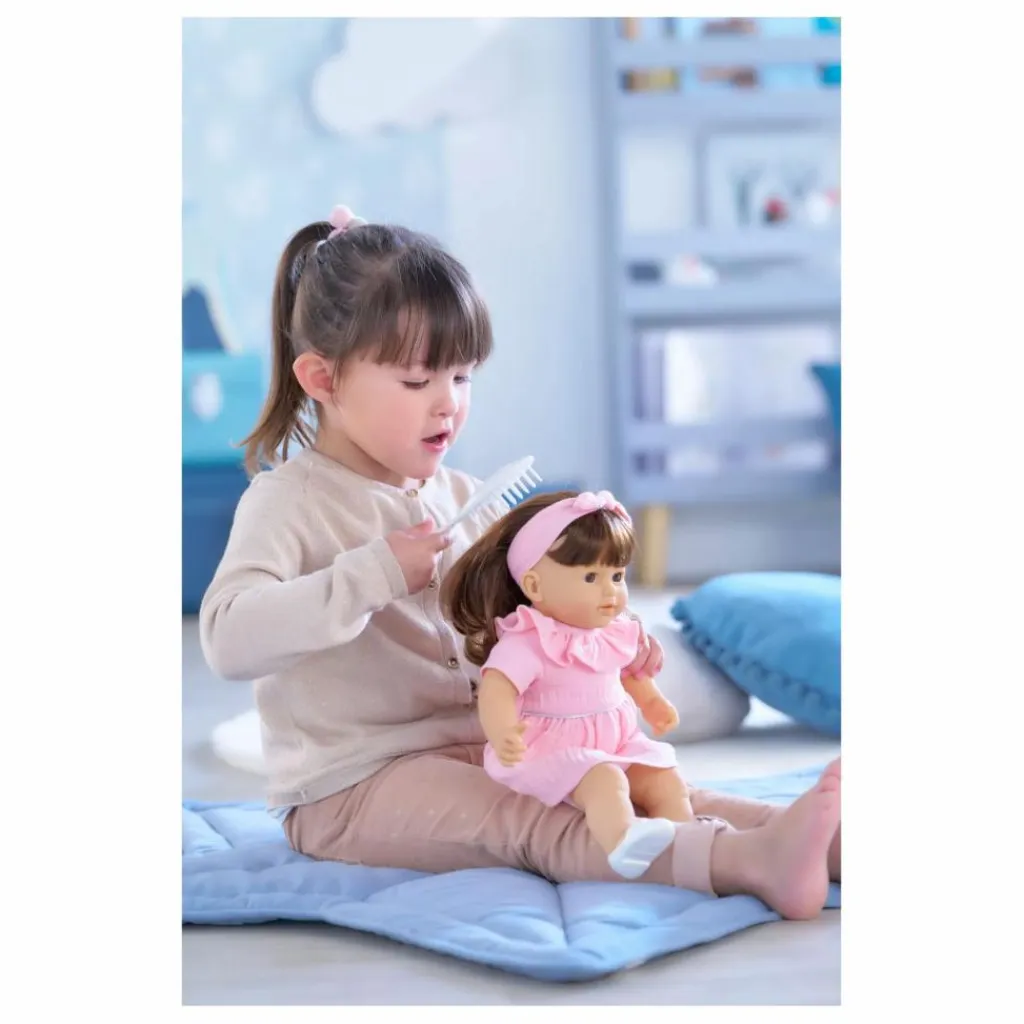Découvrez Julie, le Grand Poupon de 36 cm à coiffer, parfait pour les petites mains ! Avec ses longs cheveux châtains et sa brosse incluse, elle invite aux jeux de coiffure. Son corps souple et léger la rend facile à manipuler, et elle peut même s’asseoir pour plus de possibilités de jeu. Julie séduit par son visage réaliste, sa peau douce au toucher, ses yeux marron dormeurs qui se ferment quand on la couche, et sa délicate senteur de vanille.