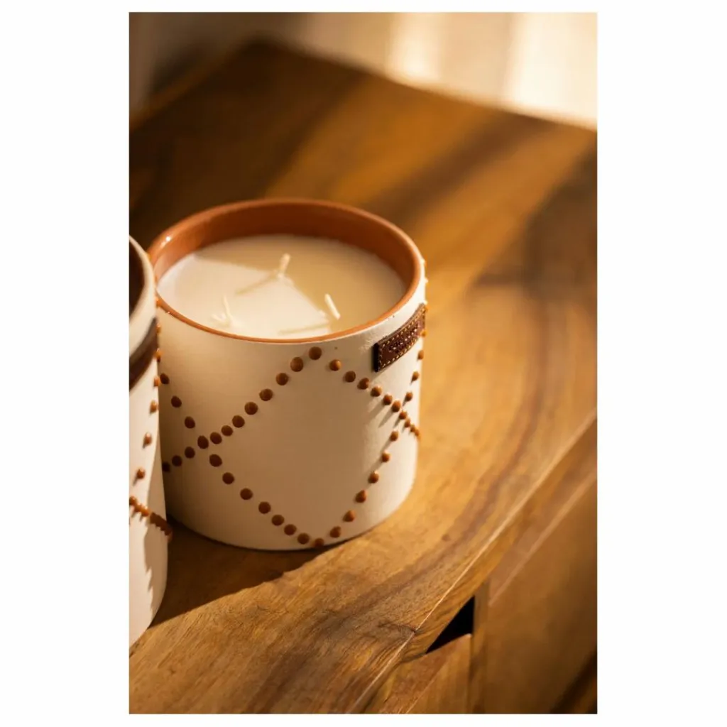 - Bougie parfumée dans un pot en céramique terracotta, façonné et émaillé à la main à Marrakech. Une pièce artisanale chaleureuse et intemporelle.