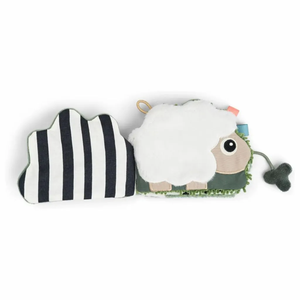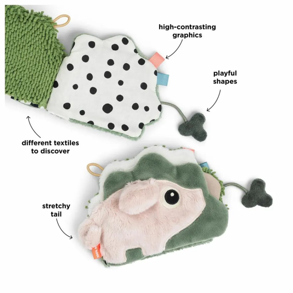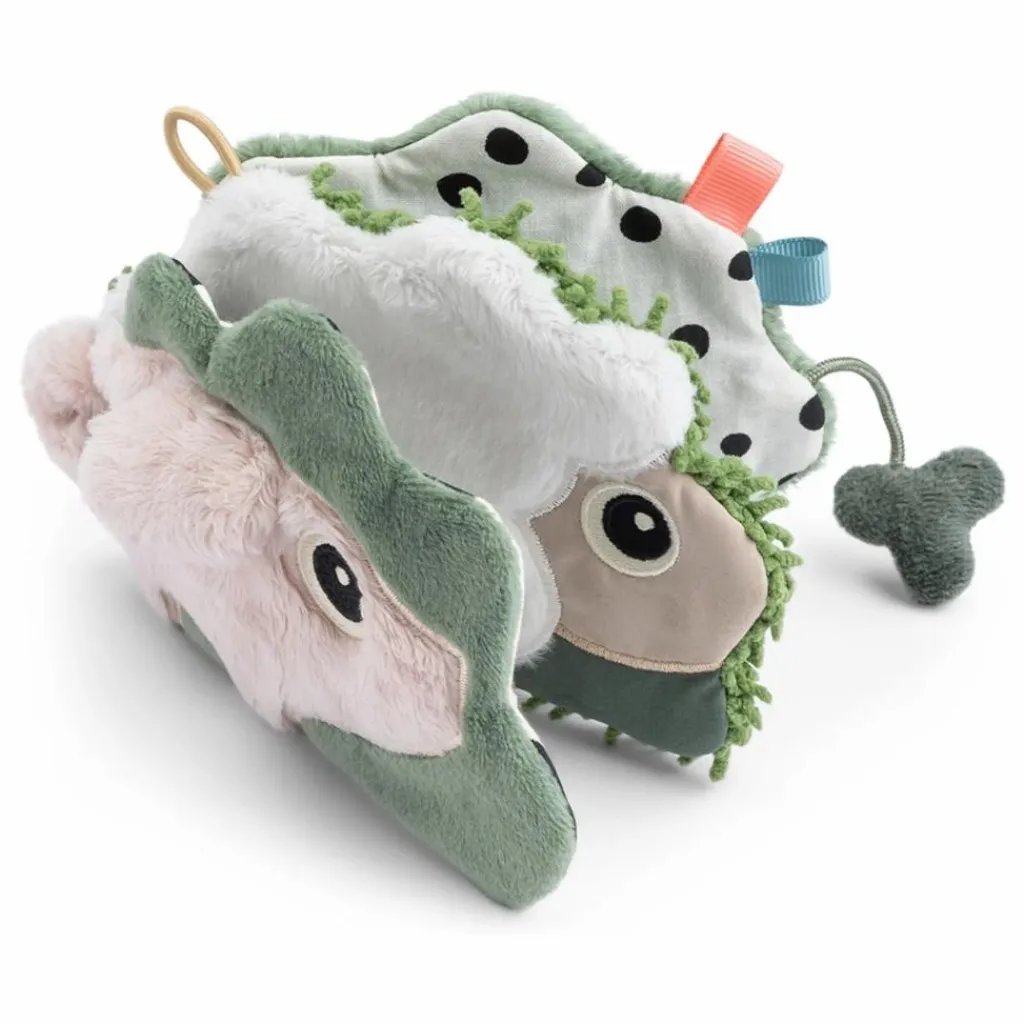 - • Bébé découvrira des éléments sensoriels comme du papier bruissant, des perles et différentes textures qui stimuleront son ouïe et son sens du toucher