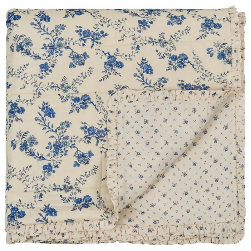 - Plaid double face écru en coton molletonnée, parsemée de fleurs bleues. L’autre face est ornée de motifs floraux aux couleurs douces et reposantes sur un fond en flanelle de coton écru. Le rembourrage est en ouate synthétique et des surpiqûres le solidarise avec la housse volantée sur le pourtour. Sur un canapé ou en bout de lit, il est aisé de lui trouver une place.