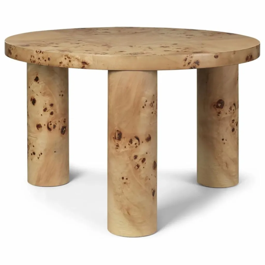 Dans une version revisitée de notre table basse Post, ce modèle propose une nouvelle version audacieuse avec sa finition en bois de loupe aux motifs magnifiques. Tout en conservant l’esprit de brutalisme qui a inspiré le design original, elle joue avec les formes pour proposer un design rond captivant. Ses trois pieds cylindriques robustes renforcent le design, faisant de cette table non seulement une pièce fonctionnelle, mais aussi un ajout saisissant à tout espace.