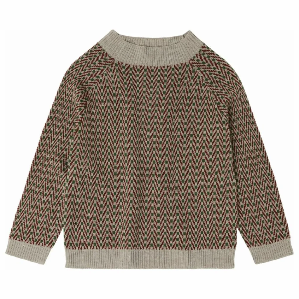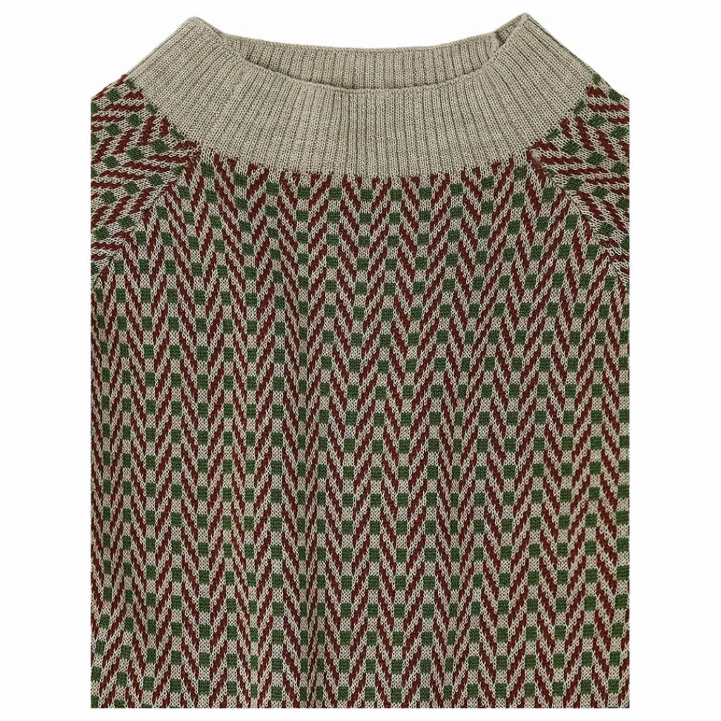 - Fabriqué en laine mérinos douce, ce pull-over jacquard est conçu avec des manches raglan et une coupe régulière. Il présente une encolure ronde haute et des ourlets côtelés. Ce pull est tricoté dans un motif graphique à chevrons. La laine mérinos est certifiée BLUESIGN® et RWS, exempte de produits chimiques nocifs et provient de moutons non mulets.