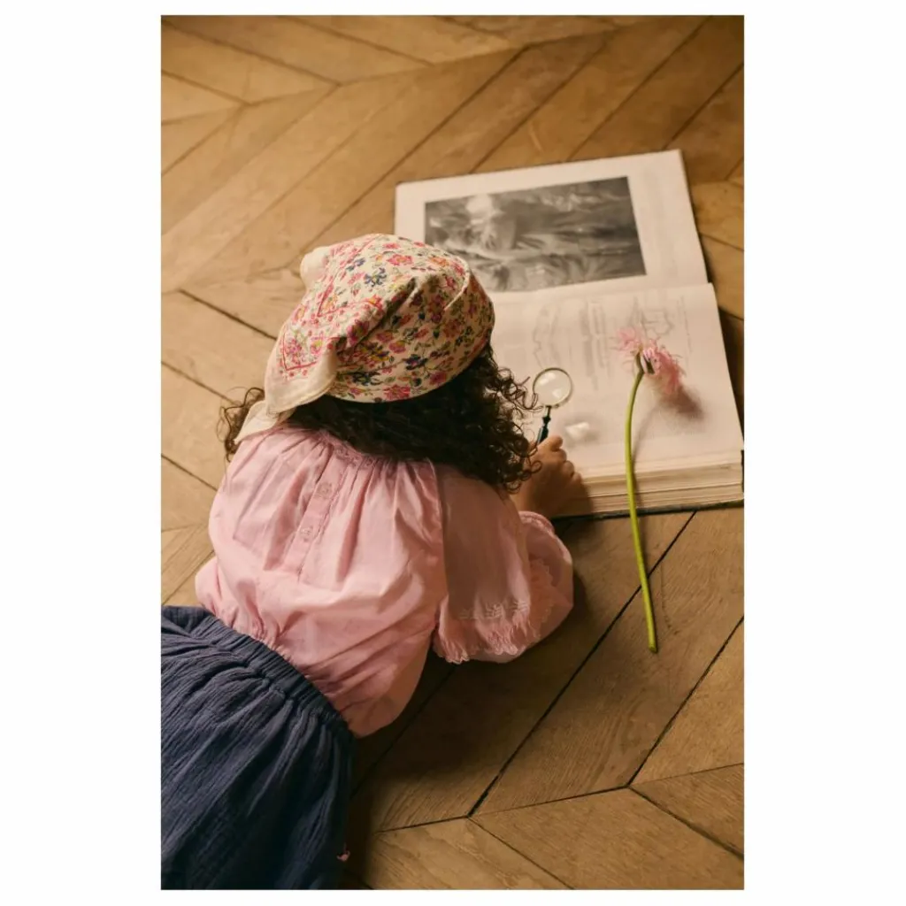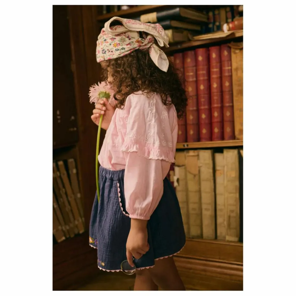 Motif fleuri brodé devant et frise fleurie brodée en bas de vêtement.