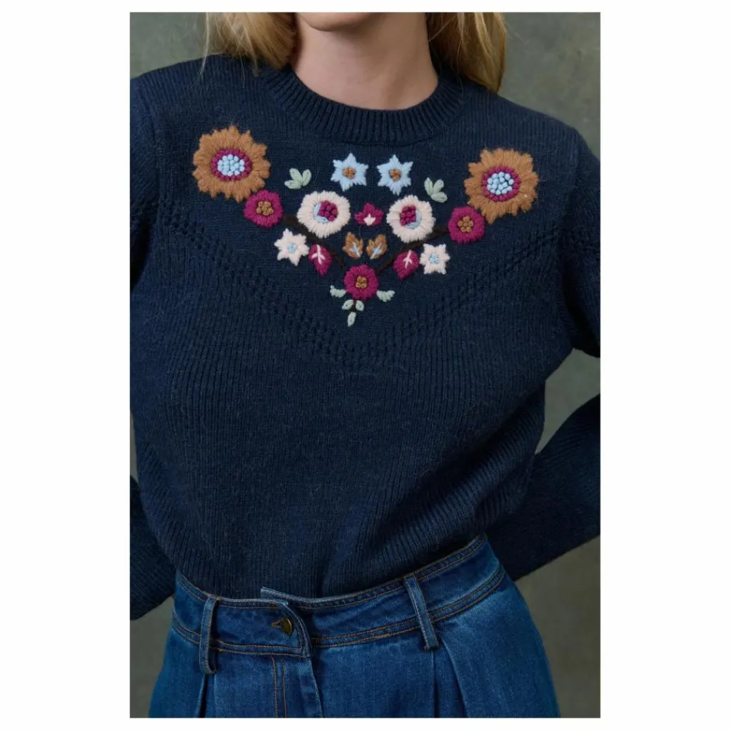 Broderies fleuries colorées faites main devant.