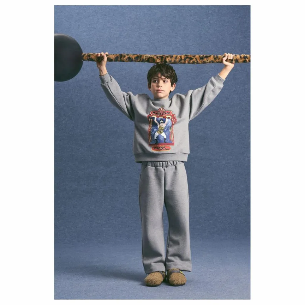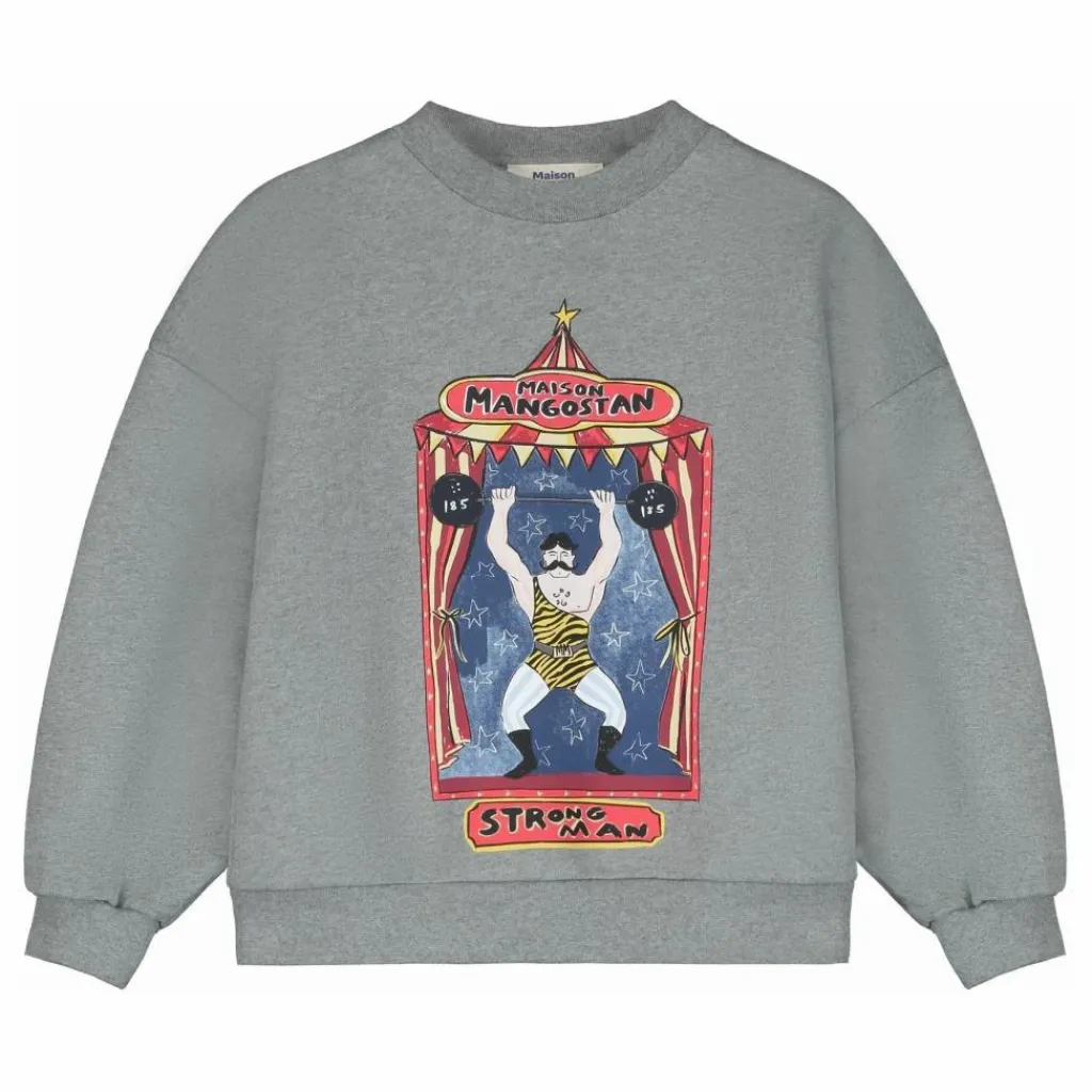 - Le sweat Strong Man en gris, avec une coupe décontractée, présente un imprimé de placement, des manches longues et un col rond. Composition : 100 % coton biologique Cet article est de taille normale, nous vous suggérons de choisir votre taille habituelle.