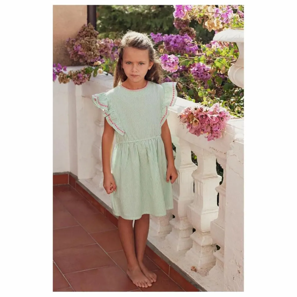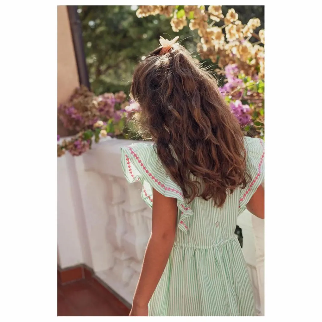 - Coton haute qualité à fines rayures blanches et vertes – col rond – manches courtes volantées ornées de broderie rose – taille élastiquée – longueur genou