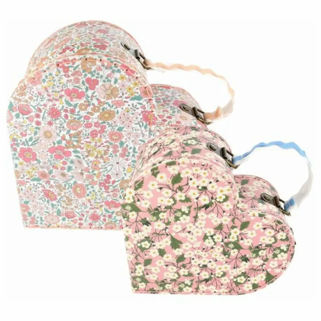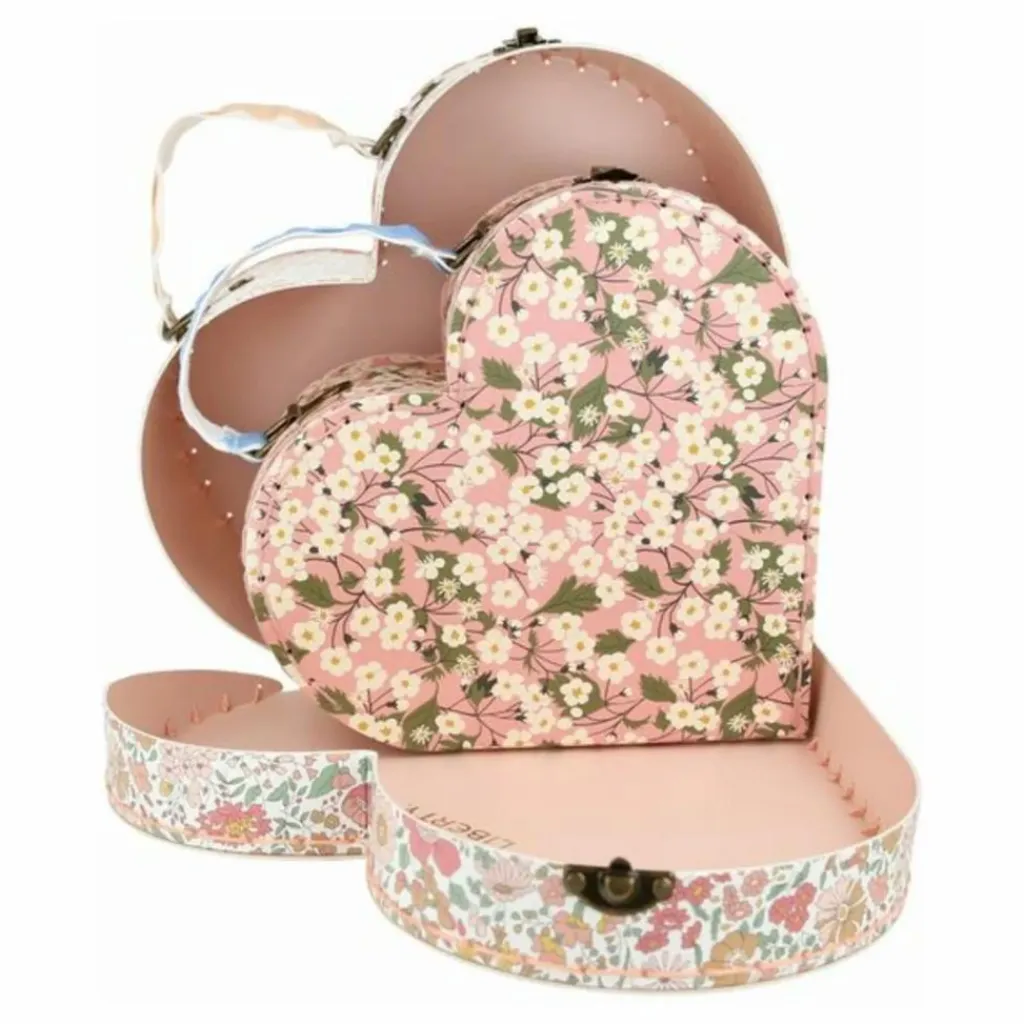 - Cet ensemble de valises sophistiqué, créé en collaboration avec Liberty, n’est pas seulement un accessoire de mode, il peut également servir de solution de rangement décorative pour votre maison. Dotés de motifs imprimés floraux Liberty dans des tons roses et de poignées en tissu ornées de détails ricrac, ils sont un incontournable pour les enfants âgés de 3 ans et plus et les adultes. Fabriquées à partir de carton durable, ces valises en forme de cœur allient fonctionnalité et élégance, ce qui en fait un merveilleux cadeau pour quelqu’un de spécial.