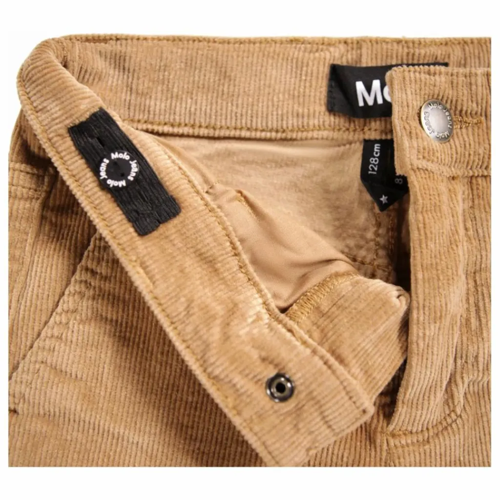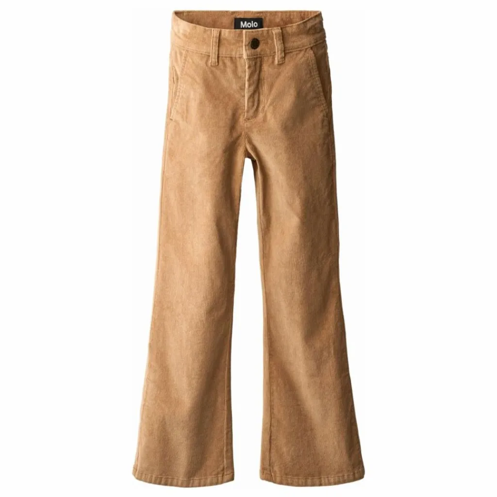 - Ce pantalon marron clair de Molo est confectionné en velours de coton doux et présente une silhouette en forme de trompette. Le pantalon est doté de poches avant et arrière ainsi que d’une fermeture à bouton et à glissière à la taille. Un élastique interne réglable assure un bon ajustement.