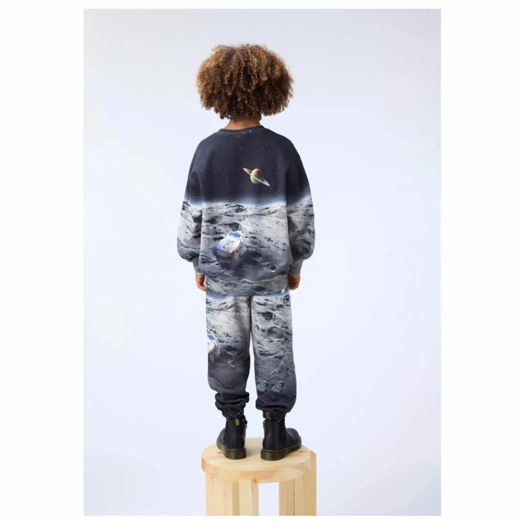 - Ce pantalon de survêtement multicolore en coton biologique de Molo a une taille élastique réglable, des poches latérales, une poche arrière simple et un élastique autour des chevilles. Le pantalon de survêtement a une coupe régulière et présente un magnifique imprimé de la lune et des planètes.