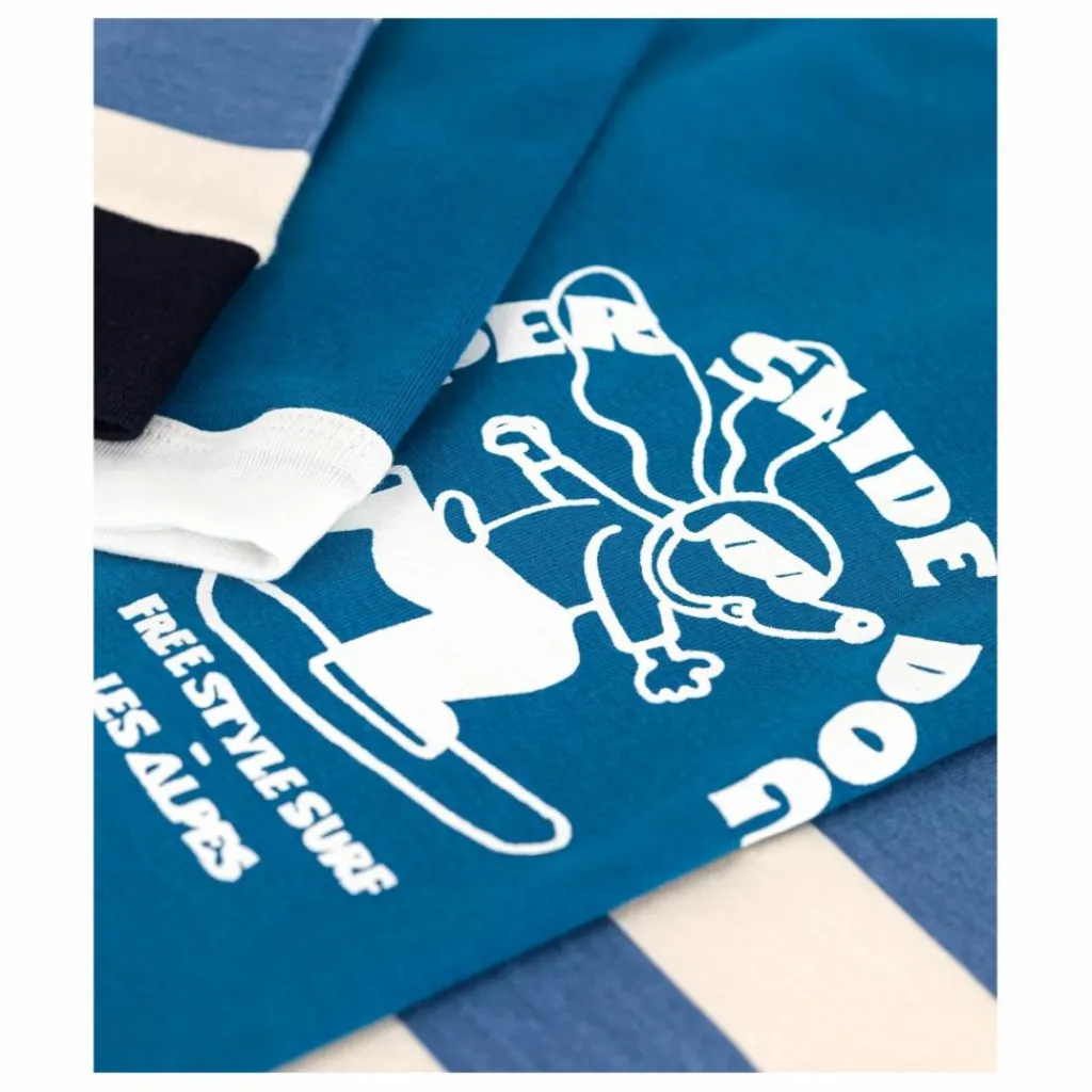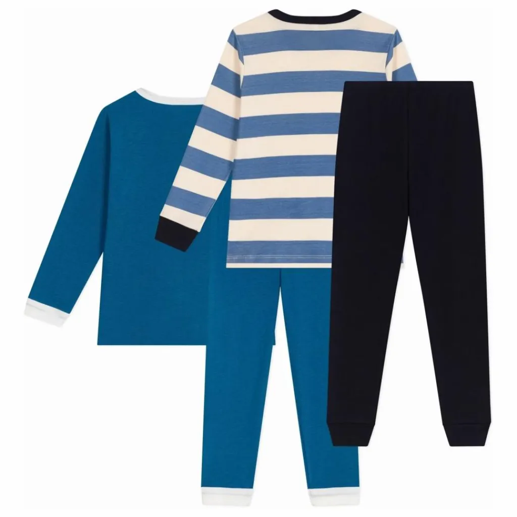 - Le premier pyjama est en côte 1×1 uni avec un motif imprimé marin sur le haut. Le second pyjama est en côte 1×1 à grosses rayures et legging en côte 1×1 unie.