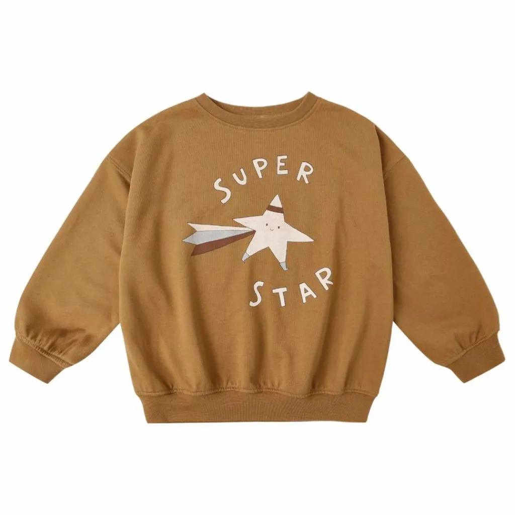 - Sweat-shirt à la coupe décontractée en tissu éponge français – la couche parfaite pour un confort quotidien. Il s’associe parfaitement à notre pantalon de jogging et arbore notre imprimé « super star » sur notre teinte « golden ».
