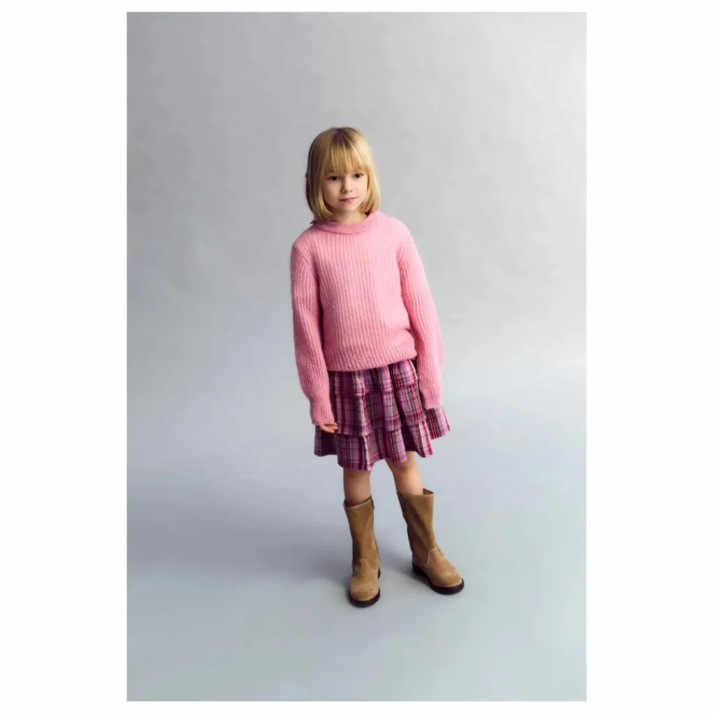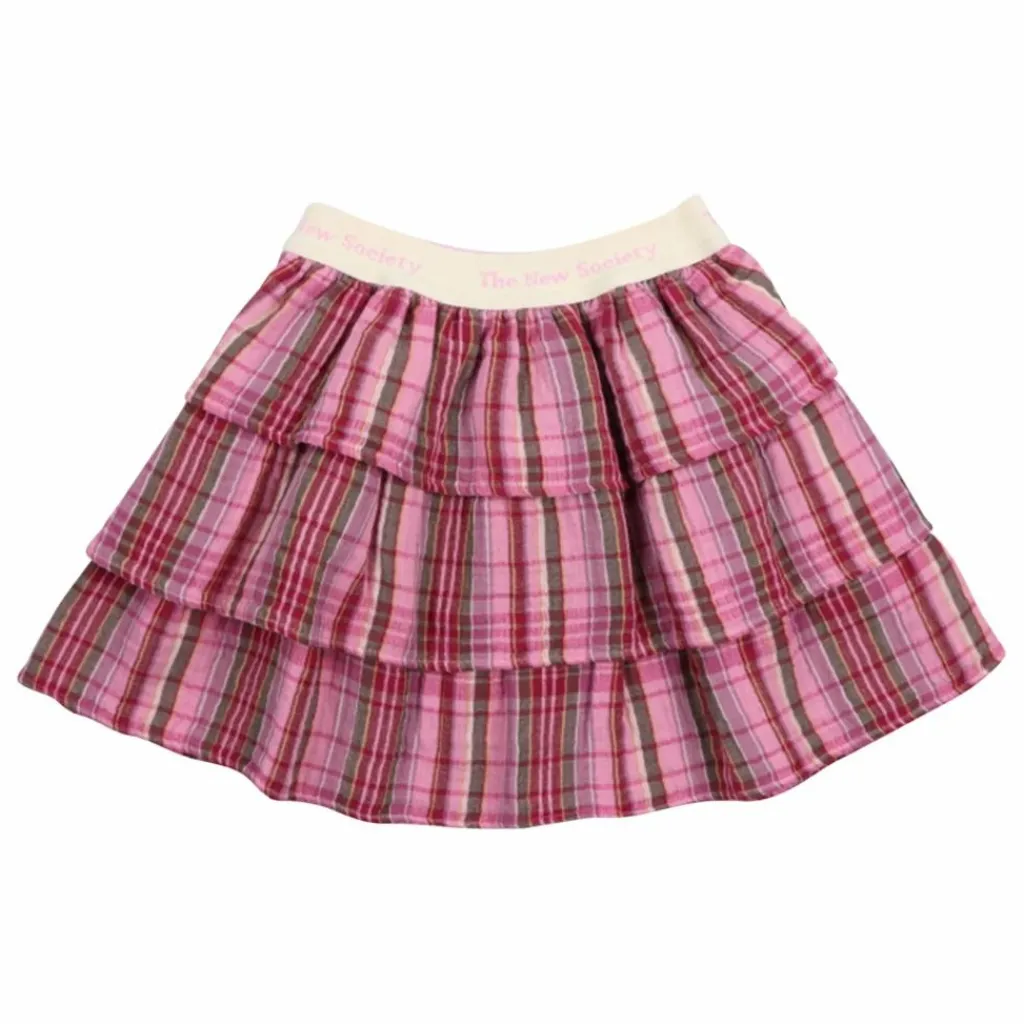 - Jupe à carreaux en double gaze avec trois volants et une ceinture élastique marquée. Parfaite pour être associée au chemisier assorti.