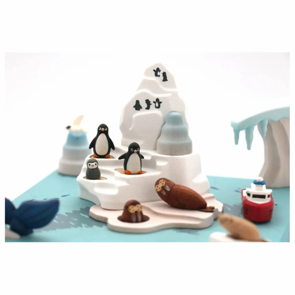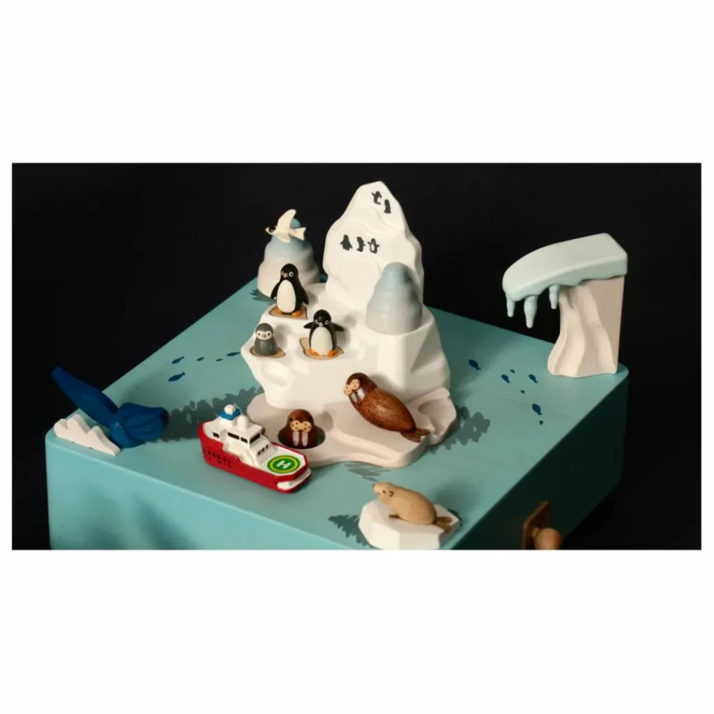 Cette boîte à musique a entièrement été réalisée en bois issu de forêts durables d’Europe, des États-Unis, du Canada et de Nouvelle Zélande. Le mouvement, créé à la main, est hérité du savoir-faire ancestral d’une manufacture japonaise. À remonter manuellement, elle joue une mélodie pendant une centaine de secondes, et livre le spectacle de son décor en mouvement. Le bateau tourne autour de la banquise.