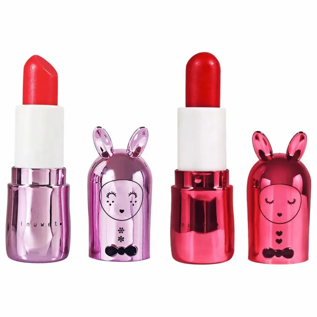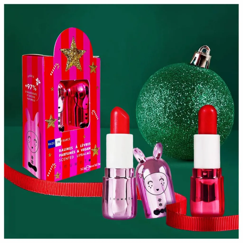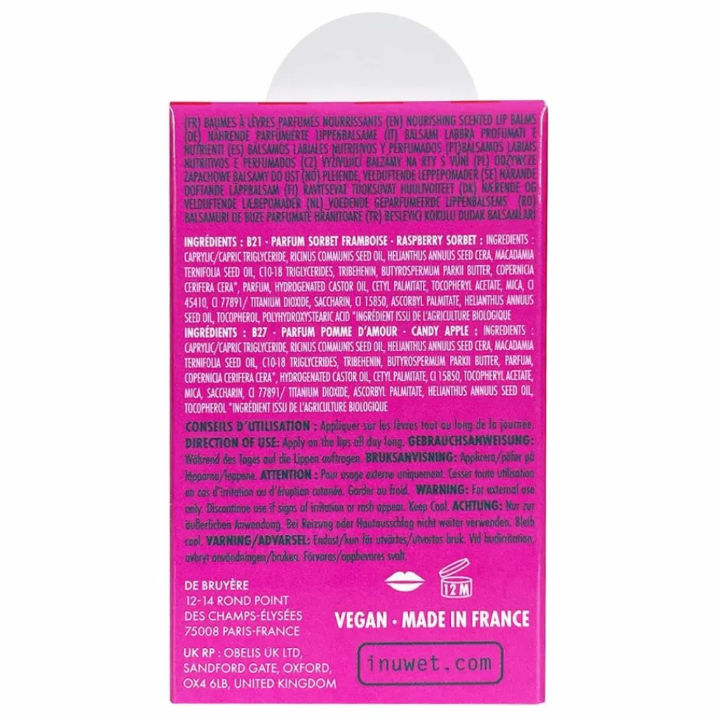 Composé de deux baumes à lèvres métal rouge et rose, nourrissants et parfumés à la framboise et pomme d’amour pour des lèvres douces, nourries et délicatement parfumées.