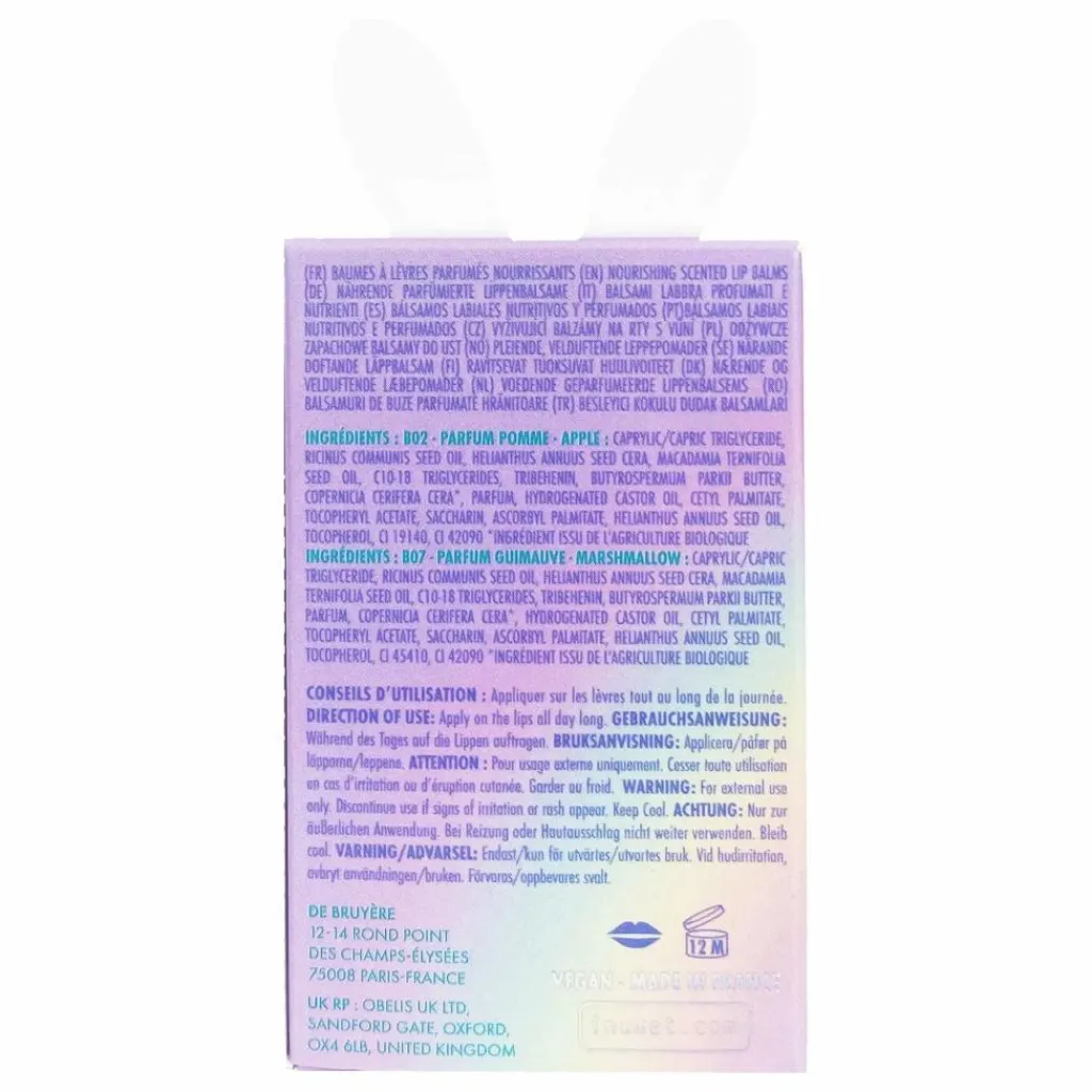 - Coffret de 2 baumes à lèvres parfums Guimauve et Pomme parfait pour offrir, ou pour soi ! Riche en beurre de karité et en huile de macadamia, ils nourrissent, réparent, adoucissent et protègent vos lèvres pour un confort absolu .