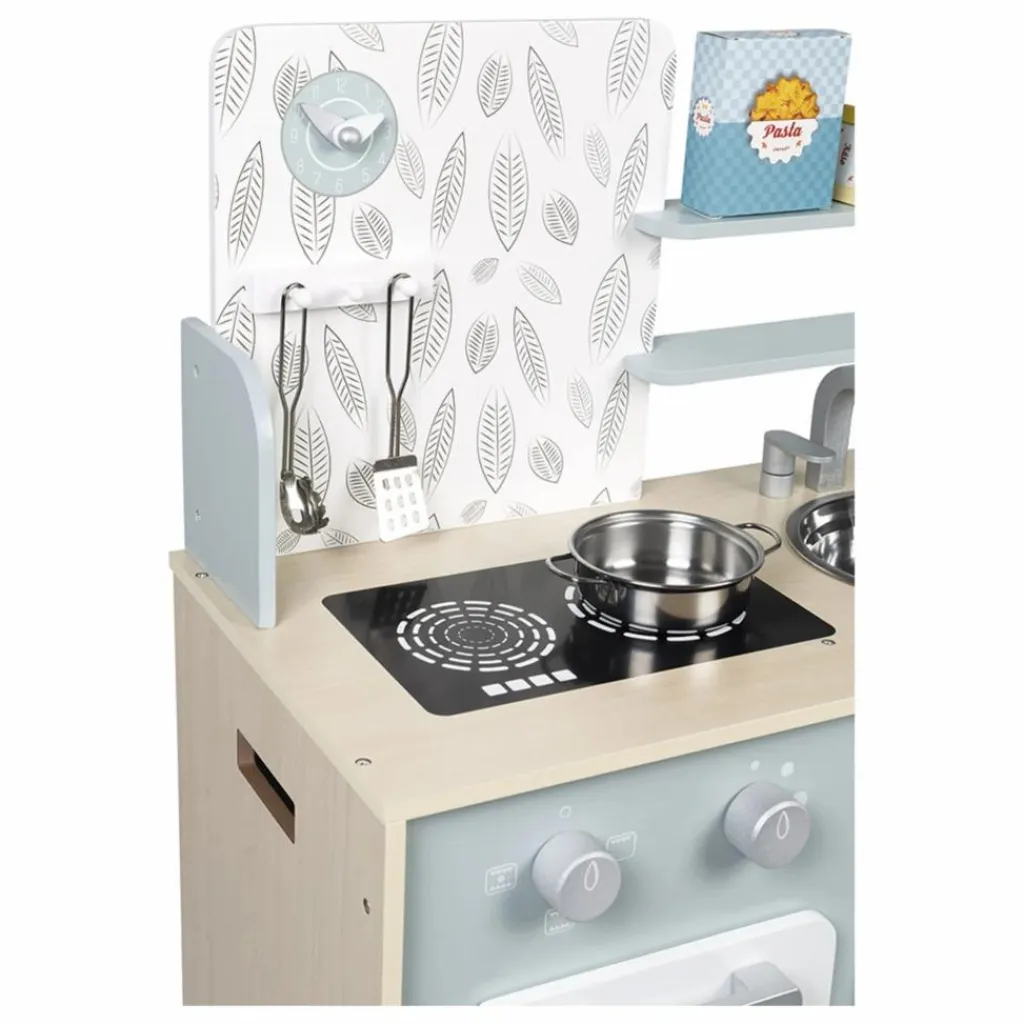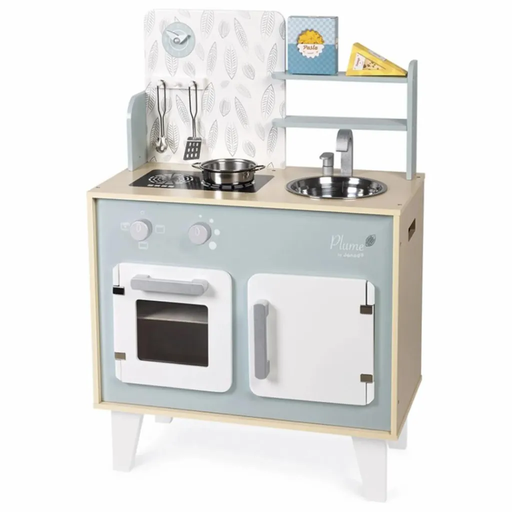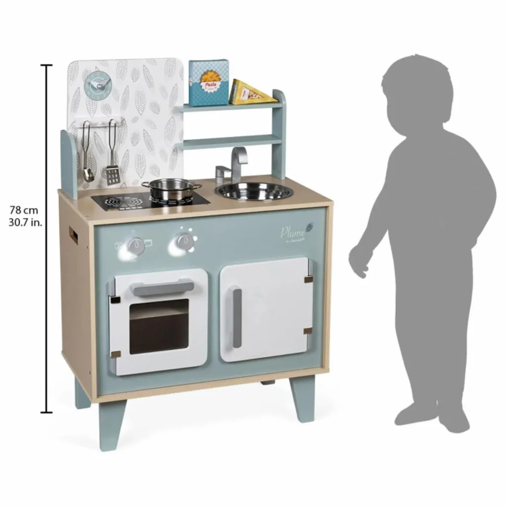 - Comme papa et maman, prépare de bons petits plats pour tes amis et deviens un vrai Petit Chef !!! Cuisine Plume toute en bois avec une patère pour suspendre la cuillère à spaghettis et la spatule en métal, accompagnées d’une casserole en métal et de 2 boites d’aliments en carton (pâtes et fromage). Comme une véritable cuisine, elle est équipée de 2 boutons rotatifs avec bruitage pour allumer les 2 plaques à induction, d’un four et d’un placard avec portes magnétiques, d’un évier en inox et d’une horloge. 5 accessoires. Hauteur du plan de travail : 50 cm. Dim : 53 x 30 x 78 cm. Pour enfants de 3 à 8 ans.