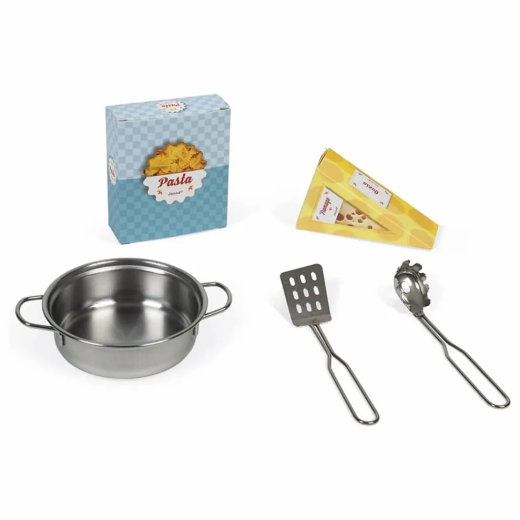 - 5 accessoires : 2 cuillères en métal, 1 casserole en métal et 2 boites d’aliments en carton