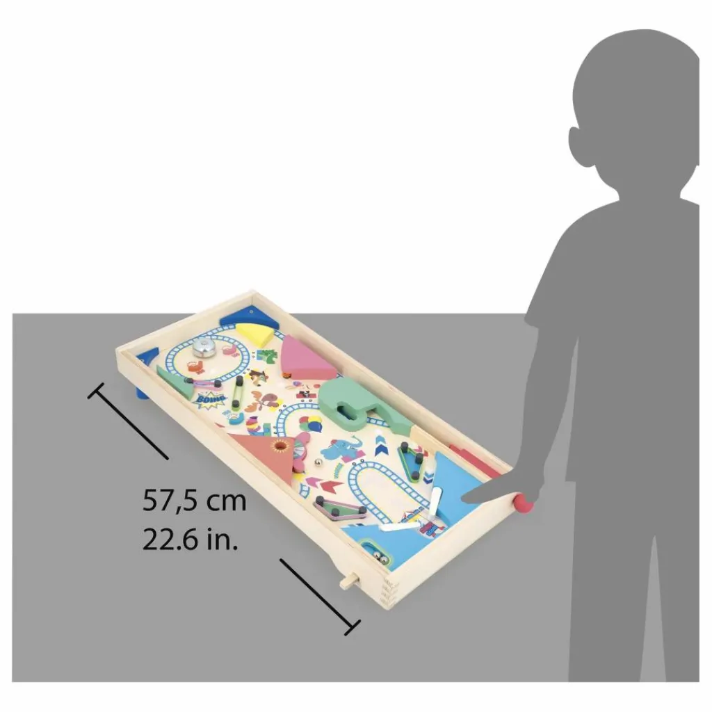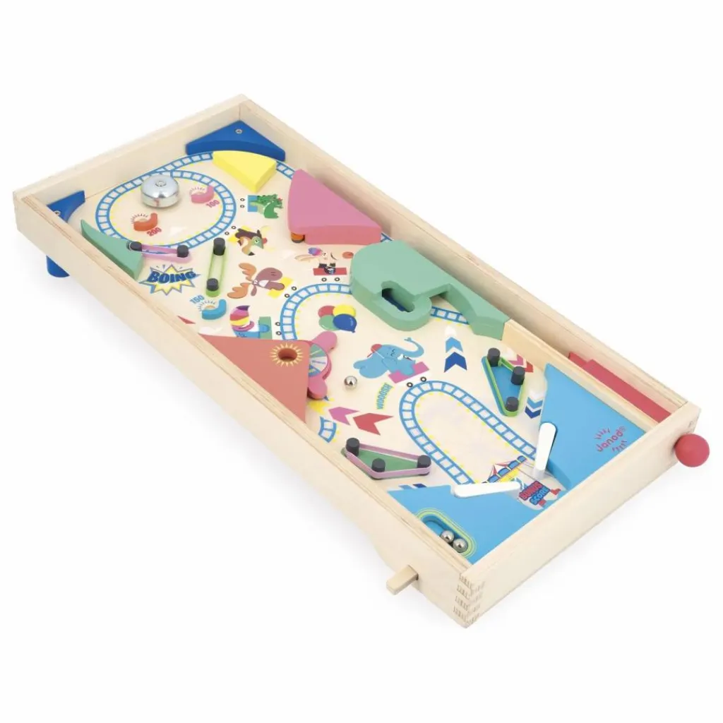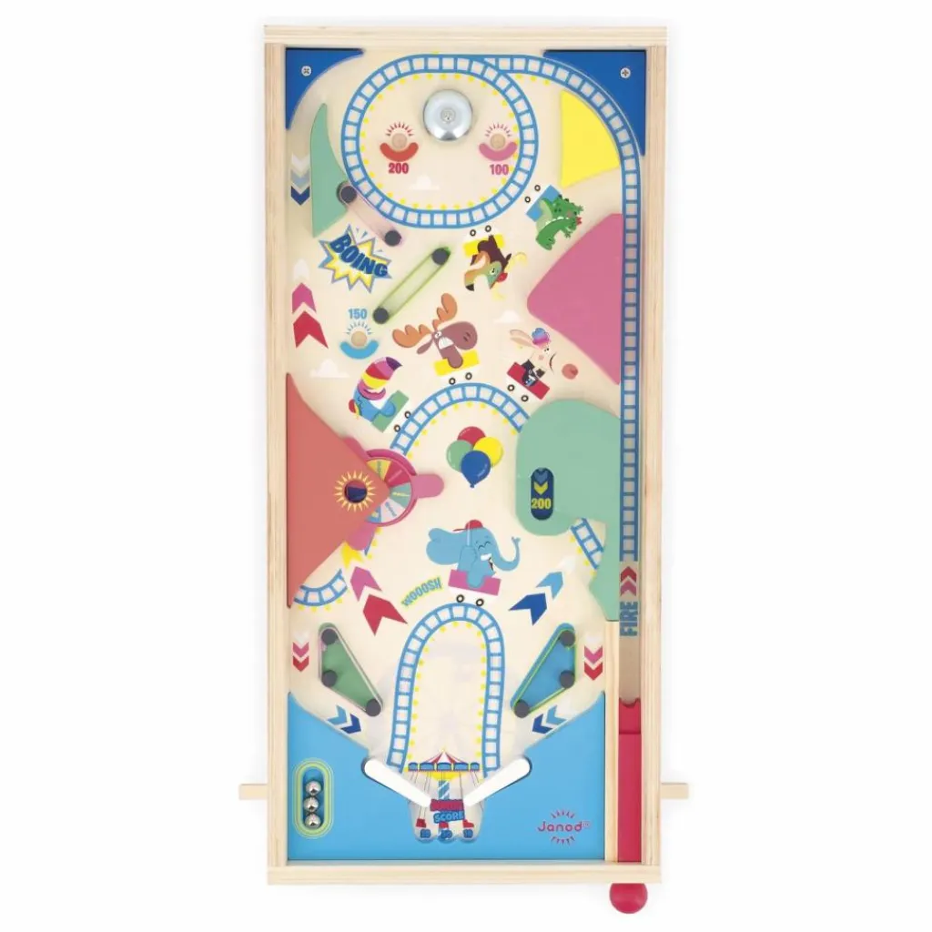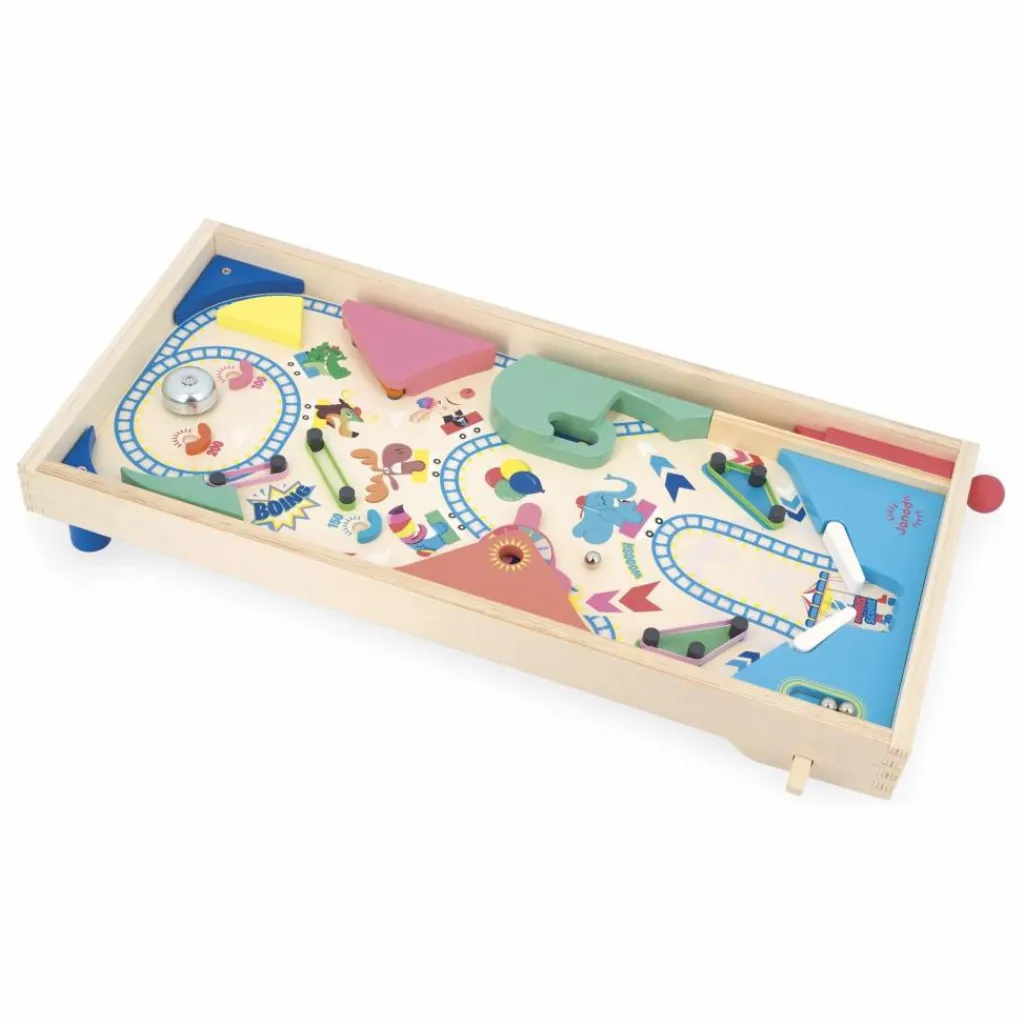 - Et c’est parti ! Qui fera le plus grand score sur ce superbe flipper en bois aux couleurs de la fête foraine ? Commencez par lancer la bille à l’aide du lanceur et tentez d’aller faire sonner la cloche ! Accumulez un maximum de point en rebondissant sur les élastiques, en faisant tourner la roulette et ou en positionnant la bille dans les zones « bonus ». Le flipper est livré avec 3 billes en métal. Il s’agit du produit idéal pour développer la coordination main-œil tout en travaillant les additions. Jouet en bois FSCTM pour les enfants à partir de 5 ans.