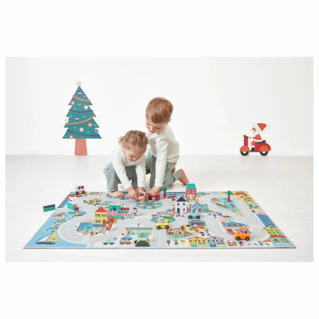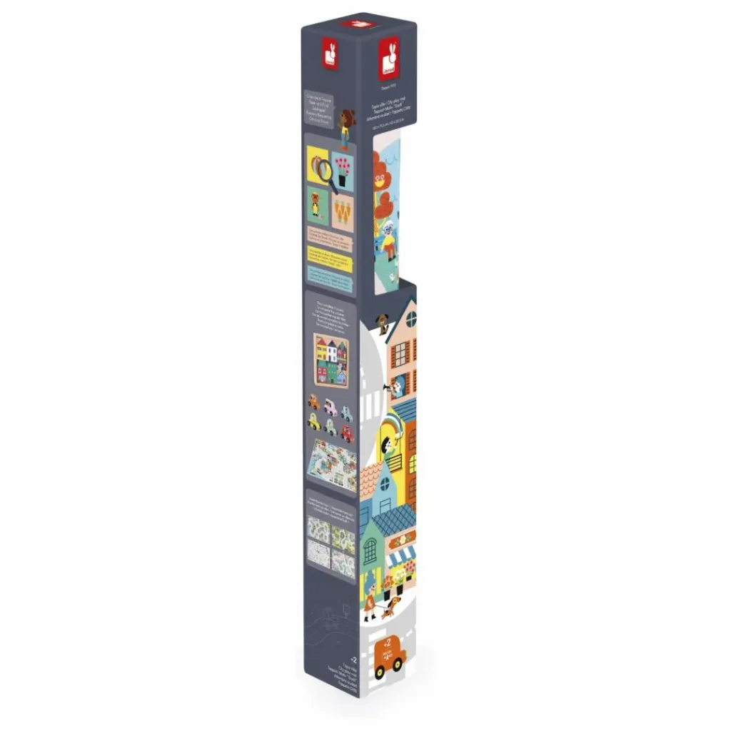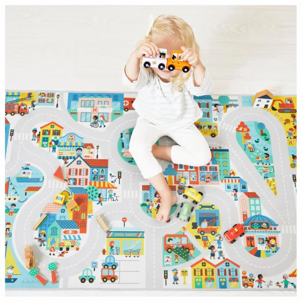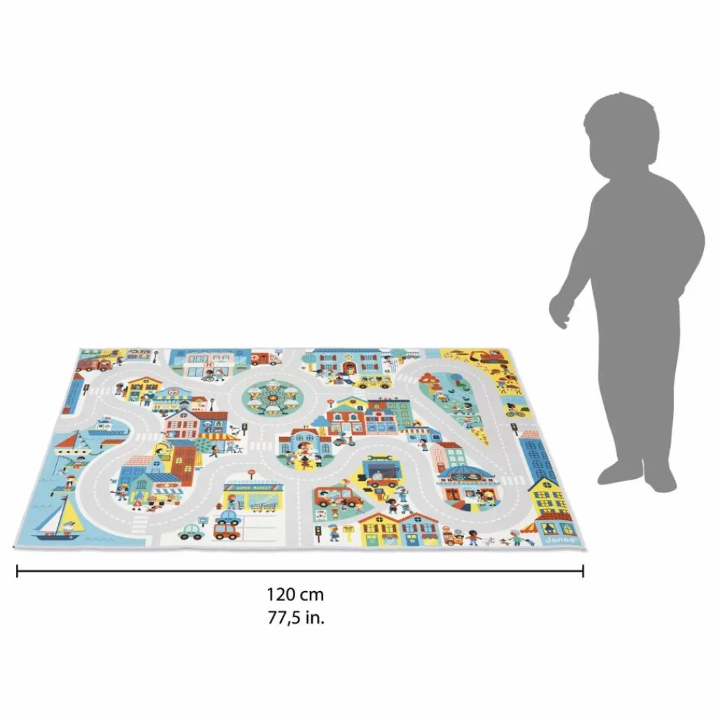 - Bienvenue dans cette ville colorée et animée où chaque coin de rue cache une surprise ! Ce tapis de jeu sur le thème de la ville possède une large et longue route pour découvrir chaque quartier et imaginer des histoires à l’infini ! En plus de stimuler l’imagination, le tapis à une fonction de cherche et trouve et permet de développer le vocabulaire. Saurais-tu retrouver le facteur ? Avec le thème de la ville, apprenez à votre enfant les métiers, les couleurs et les émotions. Le petit plus : le tapis est anti-dérapant ! Ainsi, votre enfant pourra facilement faire rouler ses petits véhicules et jouera en toute sécurité. Jouet d’imitation pour les enfants à partir de 2 ans. Ton tapis peut être complété d’une jolie panoplie de véhicules et de cubes en bois à retrouver dans la gamme Janod. Tu peux aussi l’associer aux autres tapis de la gamme pour créer un espace de jeu géant !