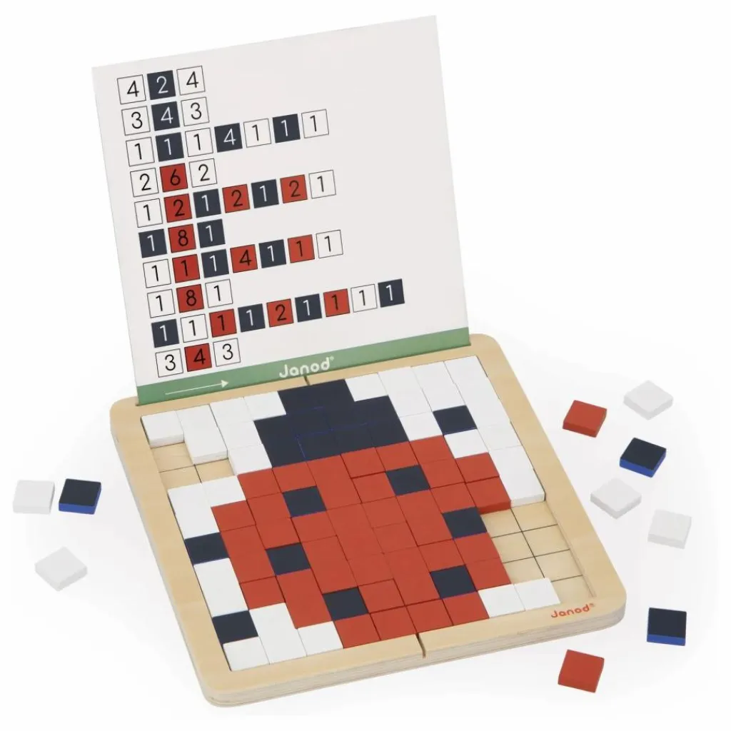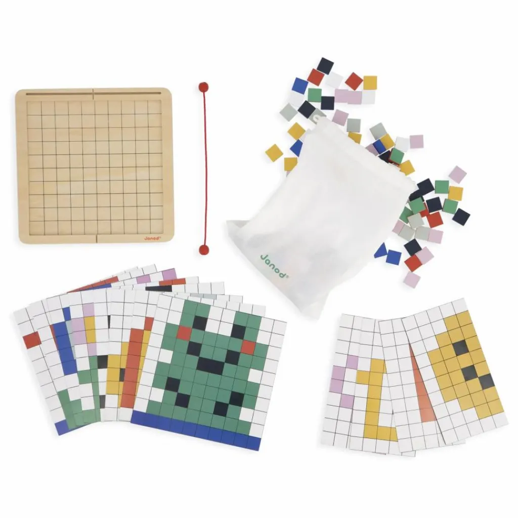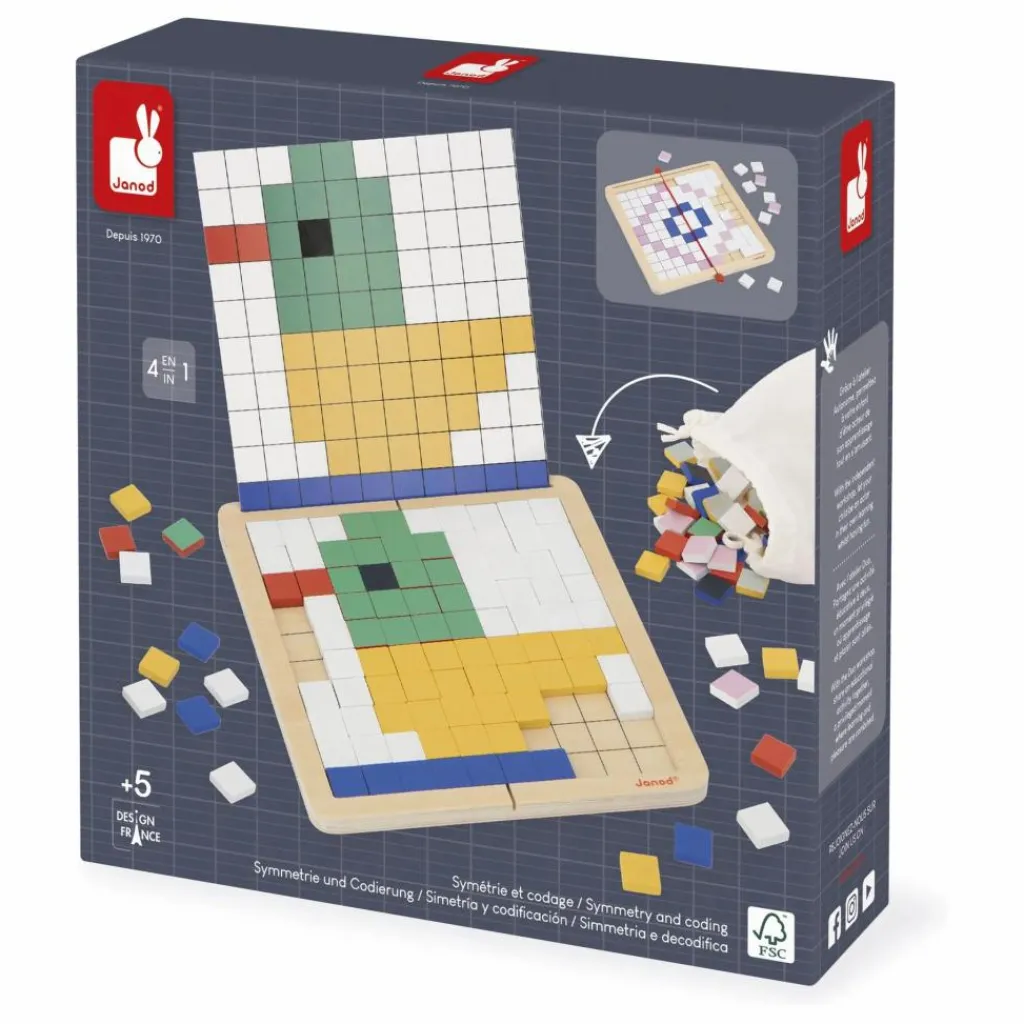 - C’est une grenouille qui apparait ! Ce jeu éducatif de codage offre 4 modes de jeu différents : 1. Superposition : L’enfant dispose les pions par-dessus la carte sur le plateau. 2. Reproduction : L’enfant positionne les pions sur le plateau d’après la carte 3. Symétrie : L’enfant reproduit par symétrie le motif de la demi-carte. 4. Codage : Grâce aux chiffres et couleurs indiquées sur la carte, l’enfant découvre l’illustration cachée. En atelier autonome ou en duo, il favorise le développement de la concentration et de la maitrise des chiffres. Composé d’un plateau en bois, 200 jetons en bois, 10 cartes modèles. Un sac de rangement est inclus. Jeu éducatif en bois et carton FSCTM pour les enfants à partir de 5 ans.