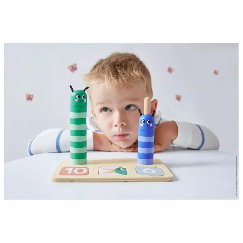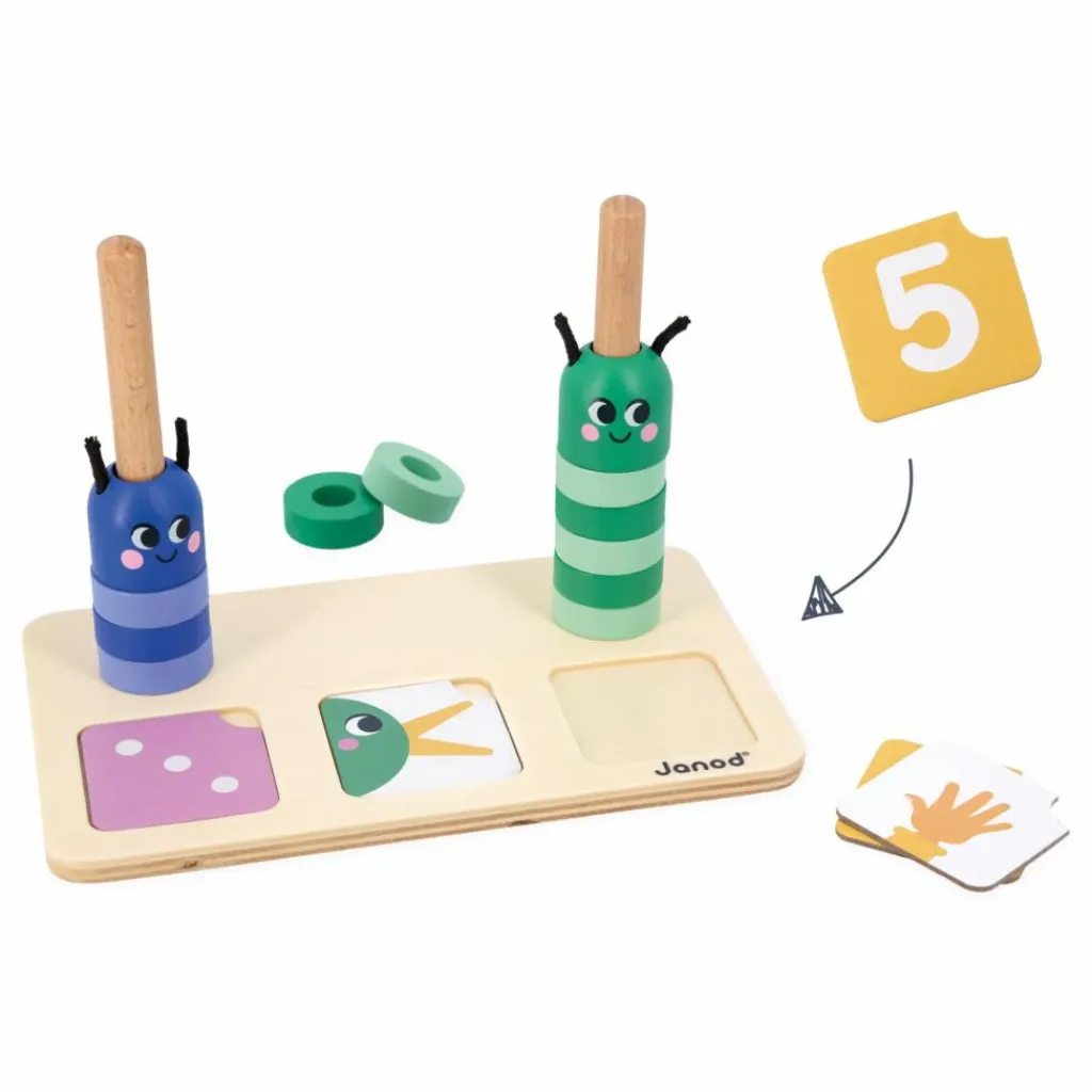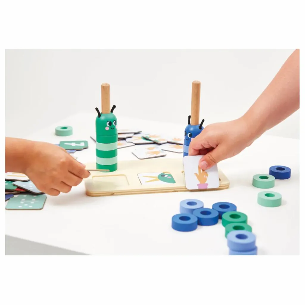 - Votre enfant va s’aider des perles de couleurs formant le corps des chenilles pour représenter les nombres des 33 cartes du jeu. Les nombres à reconnaitre peuvent prendre la forme de chiffres, des doigts de la main ou de la constellation d’un dé. En empilant les perles sur le support, votre enfant comprendra combien il faut ajouter ou enlever de perles au corps de la chenille pour obtenir une quantité donnée. Une fois cette première étape maitrisée, vous pourrez aborder la notion de comparaison « plus grand que » et « plus petit que » grâce aux cartes dédiées.
