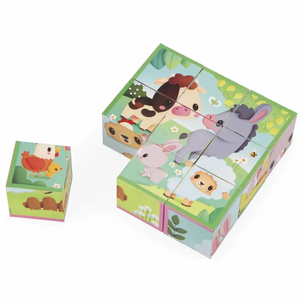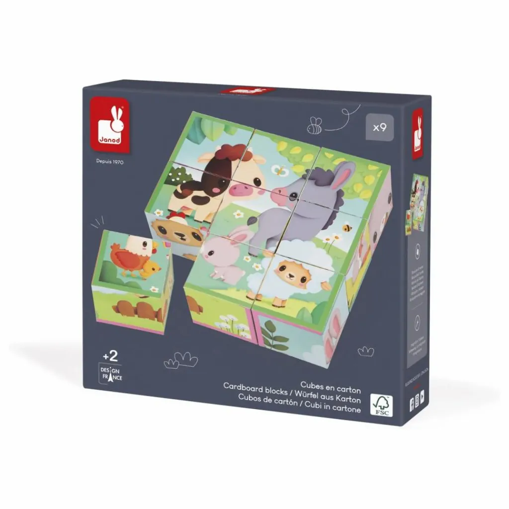 - Venez faire un petit tour à la ferme et découvrir tous ses animaux trop mignons ! Voici 9 cubes en cartons qui permettent de composer 6 scénettes sur le thème des animaux de la ferme avec : un mouton, un lapin, un âne, une vache, une poule avec son poussin et tous les animaux réunis. Un liseré de couleur, différent pour chaque puzzle, est une aide précieuse pour l’enfant. Cubes légers, faciles à manipuler, parfait pour développer la motricité fine des petits et l’imagination des plus grands. Jouet d’éveil en carton FSCTM. Pour les enfants à partir de 2 ans