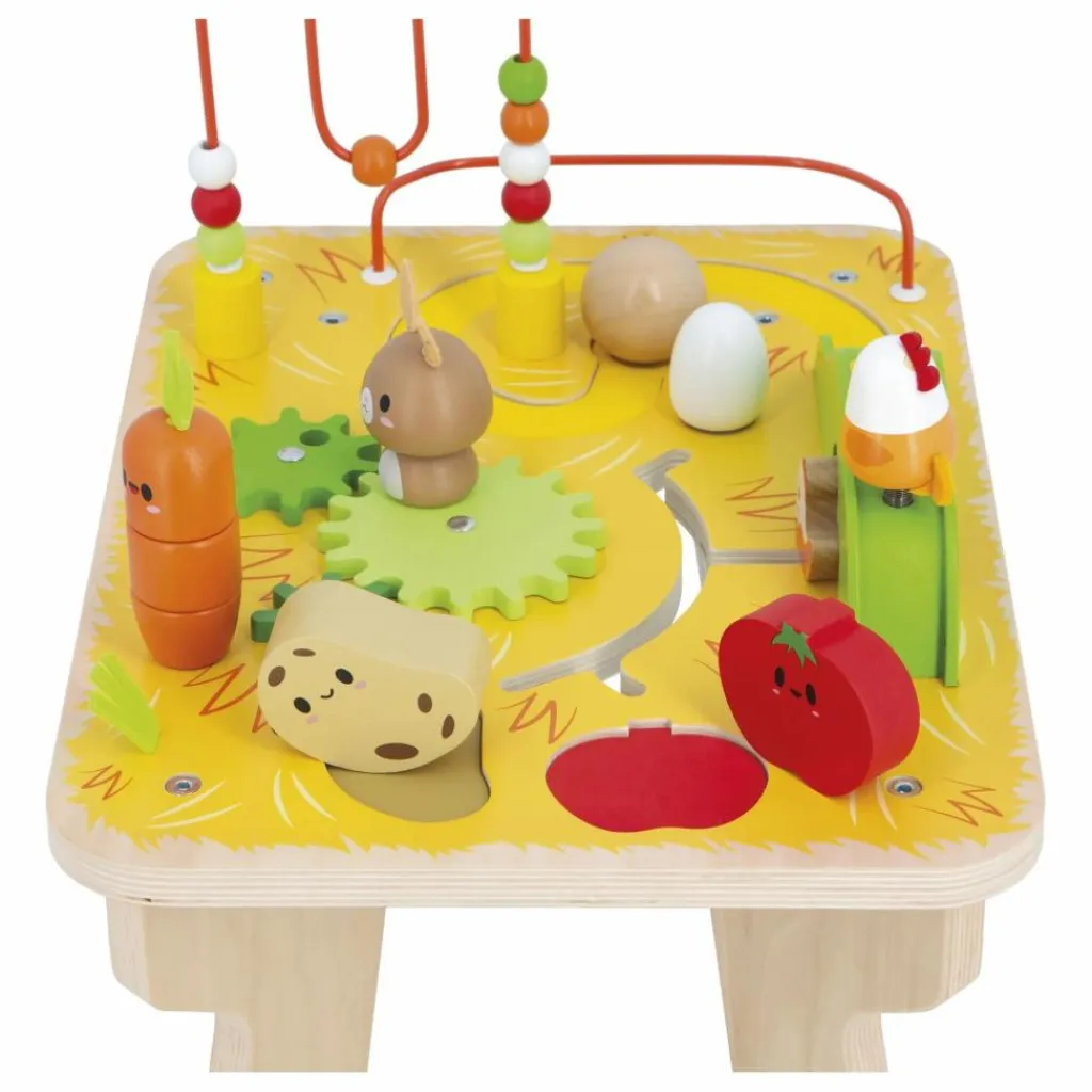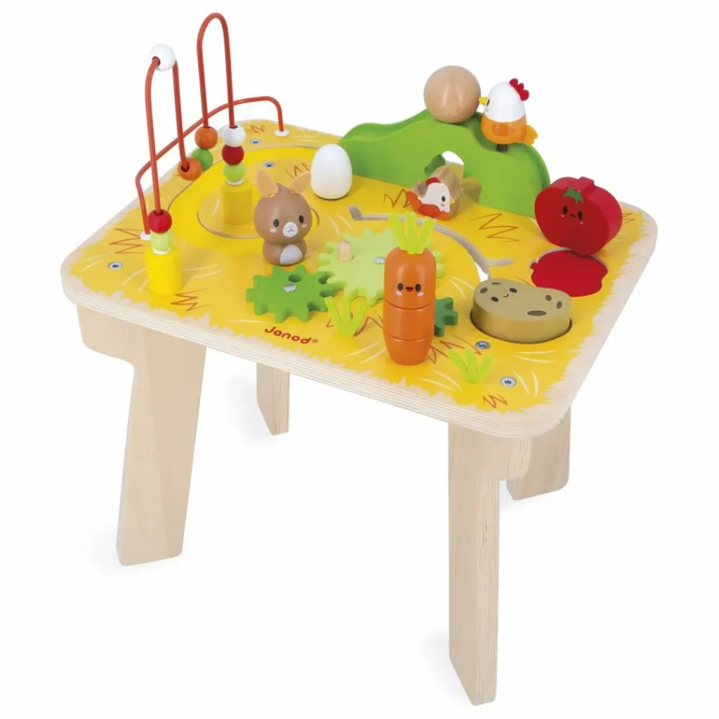 - Bienvenue à la ferme ! Venez découvrir ses animaux et ses activités ! Votre enfant fera la connaissance d’une poulette sur ressort, lanceuse de boule en bois, ainsi que d’une poulette qui se promène dans son labyrinthe et vient se cacher sous la colline verte. Il découvrira également un œuf sonore rotatif et un lapin amovible qui vient entrainer les engrenages. Côté jardin, il pourra empiler les 3 pièces d’une carotte sympathique et se familiariser avec la pomme de terre et la tomate. Enfin, il pourra jouer, sans jamais se lasser, avec le looping coloré. Toutes ces activités développent la motricité fine et la construction visuo-spatiale de votre enfant. Jouet d’éveil en bois FSCTM. Pour les enfants à partir de 12 mois.
