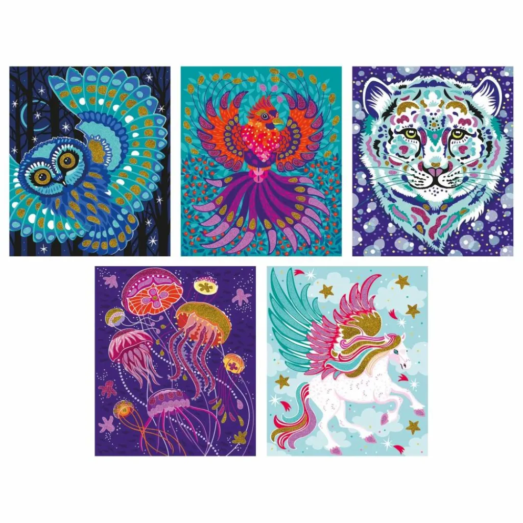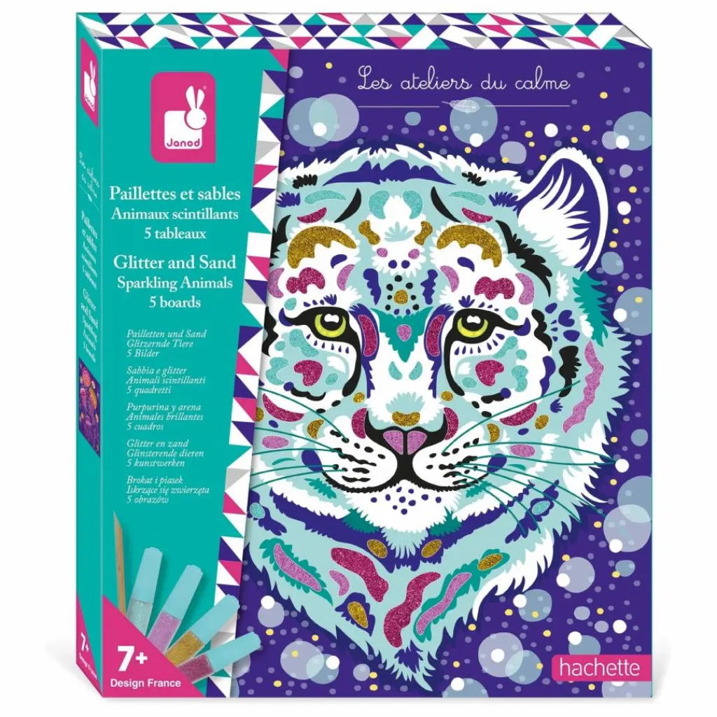 - Pars à la rencontre d’un tigre majestueux, d’une fantastique licorne ou encore d’une chouette hypnotisante ! Ce coffret créatif permet de réaliser 5 tableaux à décorer avec du sable et des paillettes. Il contient 5 tableaux autocollants, 2 tubes de paillettes biodégradables, 2 tubes de sable, 1 outil en bois et 1 livret avec les instructions et les modèles. Cette activité permet de développer sa patience et sa créativité et nécessite environ 30 minutes par tableau. Elle est idéale pour les enfants à partir de 7 ans.