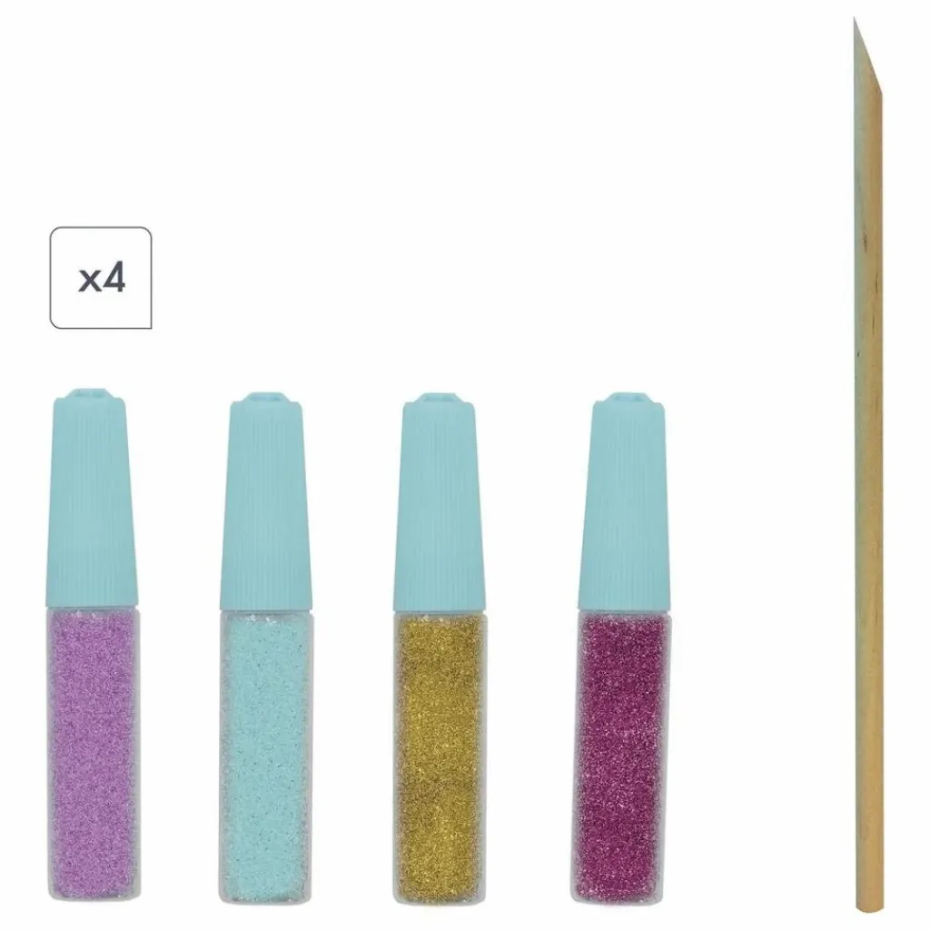 - 5 tableaux, 2 tubes de paillettes biodégradables, 2 tubes de sable, 1 outil en bois et 1 livret avec les instructions et les modèles