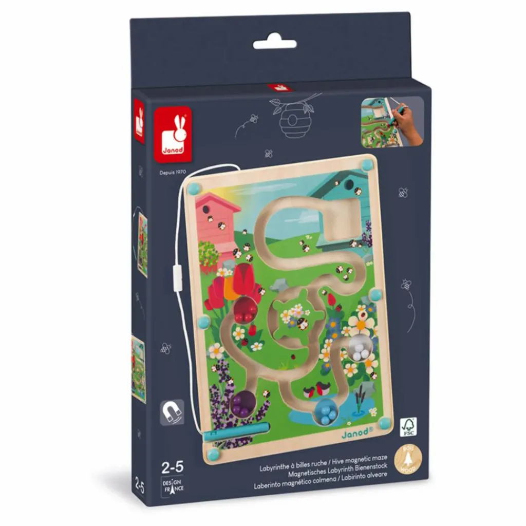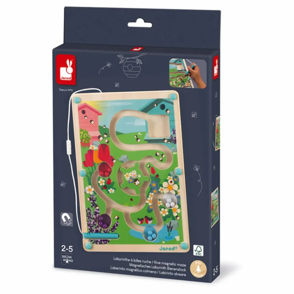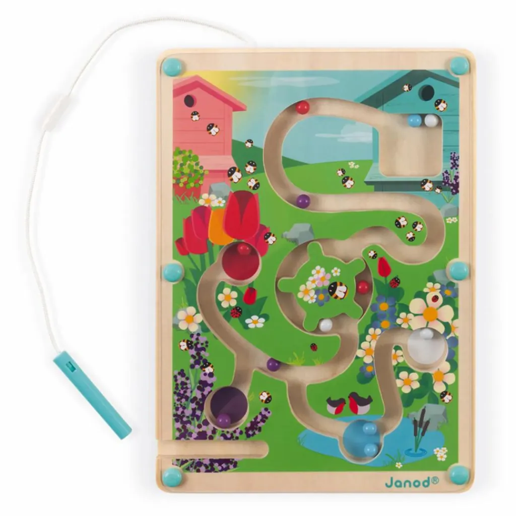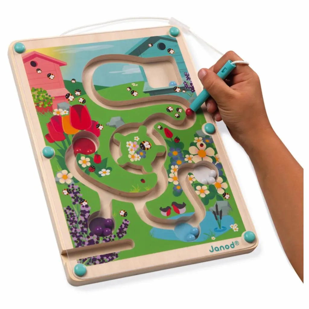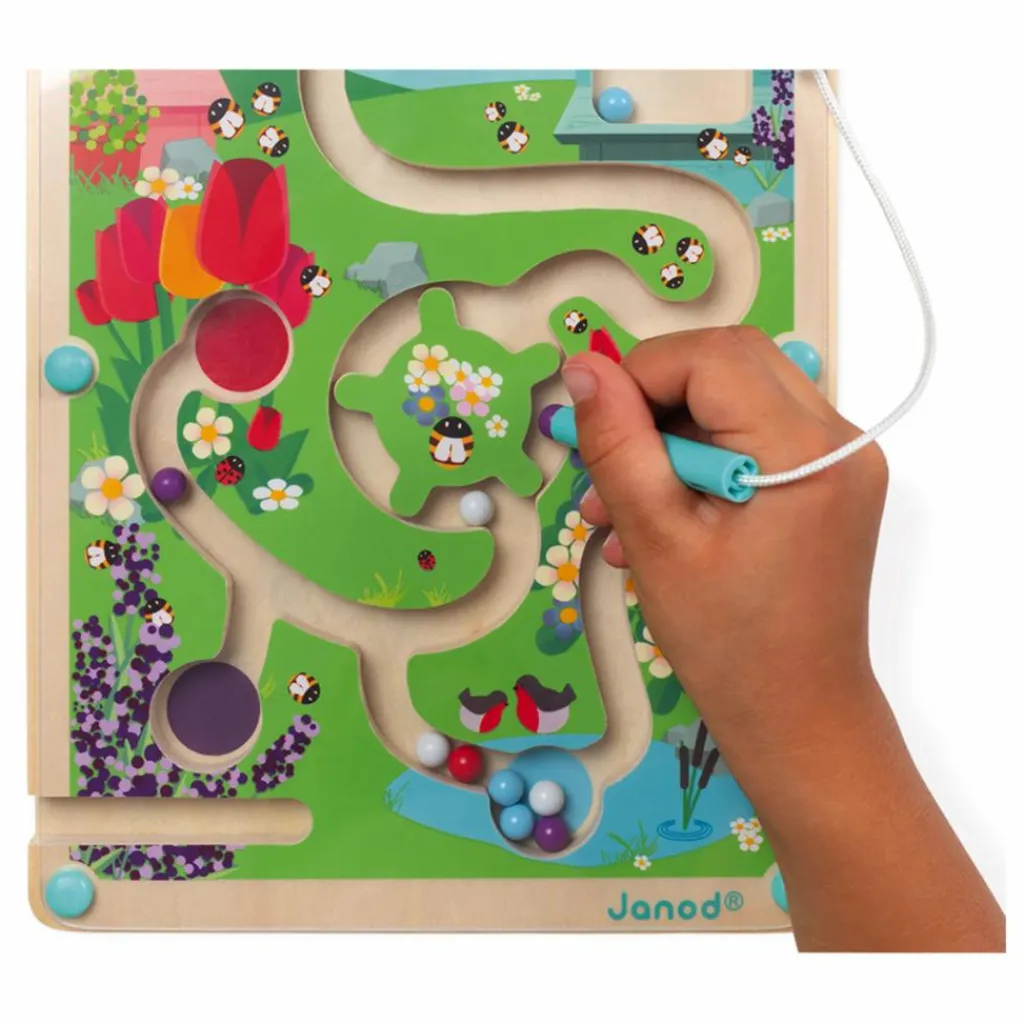 Ce labyrinthe est un jeu de patience et de dextérité qui fera travailler la motricité fine de votre enfant tout en lui apprenant à bien tenir un crayon. Depuis la ruche, il faudra traverser le labyrinthe et apporter les 12 billes colorées dans la zone correspondante à l’aide du stylet magnétique. Les billes bleues doivent se retrouver à la mare, les rouges au milieu des tulipes etc… Mais attention à bien prendre le tourniquet pour ne pas être bloqué !