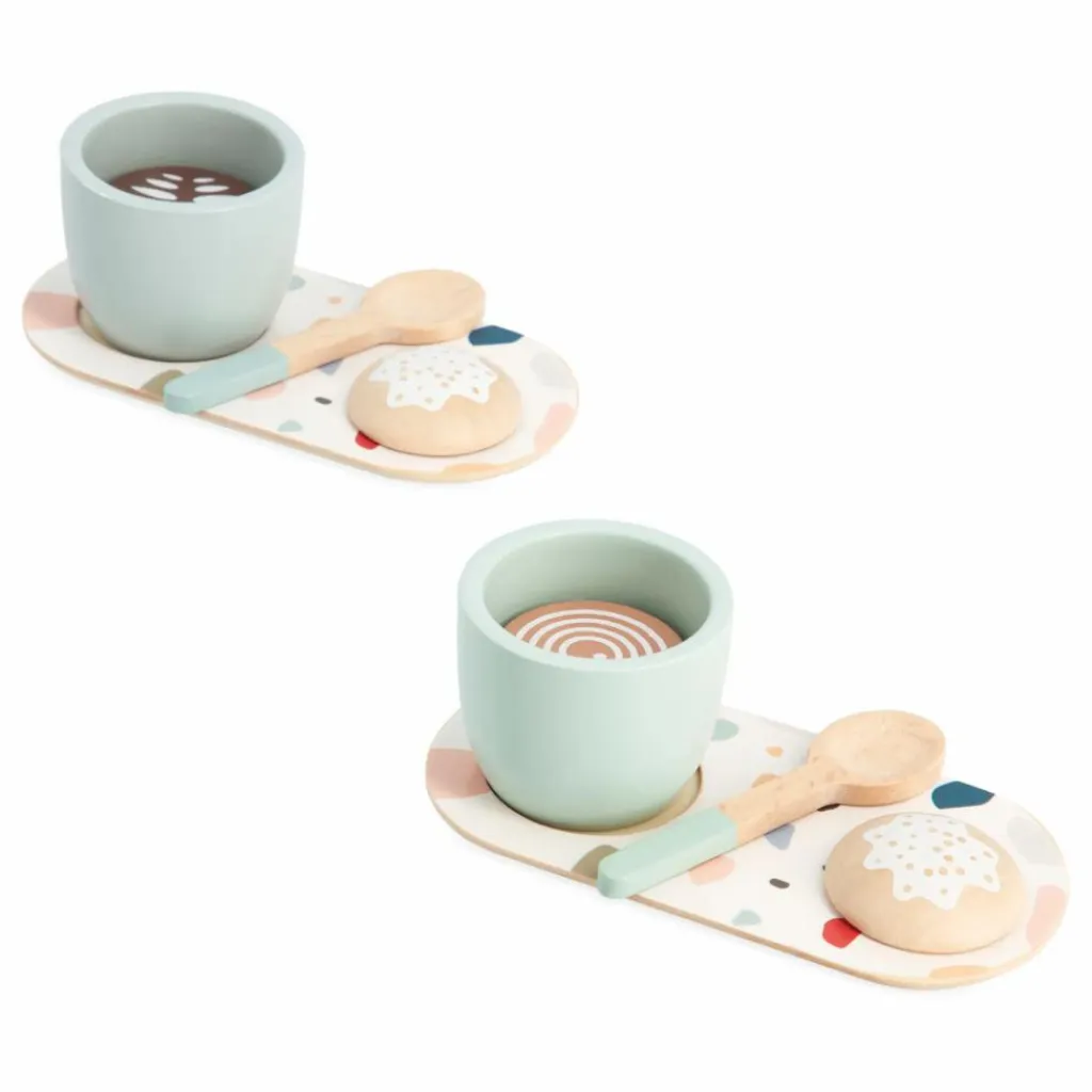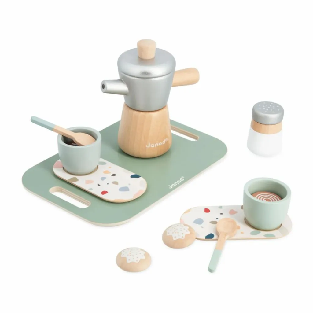 - 13 pièces : 1 plateau avec poignées, 1 cafetière à l’italienne, 1 sucrier, 2 tasses à café, 2 sous-tasses, 2 cuillères à café, 2 biscuits, 2 types de café (noir et capuccino)