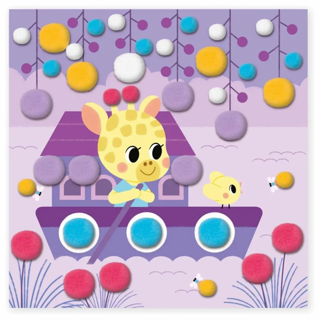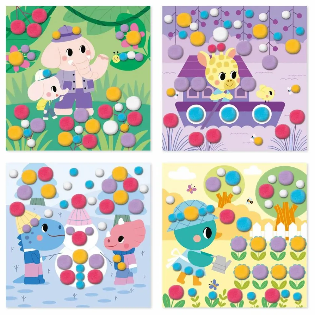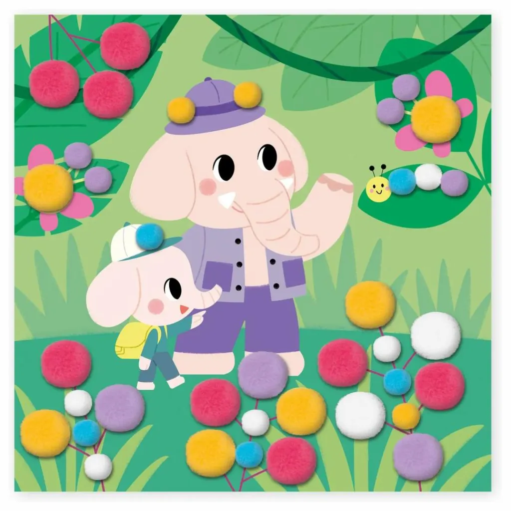 - As-tu déjà vu un éléphant faire un safari? Ce coffret est composé de 4 tableaux à décorer à l’aide de pompons. Il est accompagné de 4 supports de tableaux à fabriquer avec la boite et de 150 pompons de 2 tailles et 5 couleurs différentes. À l’aide du livret d’instructions et des contours colorés présents sur les tableaux, il suffit de coller le pompon de la bonne couleur et de la bonne taille sur son emplacement. Un tableau nécessite environ 20 minutes. Cette activité est idéale pour les enfants à partir de 3 ans et permet de développer la motricité fine et la concentration.