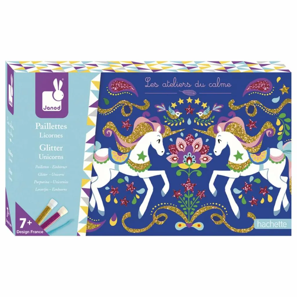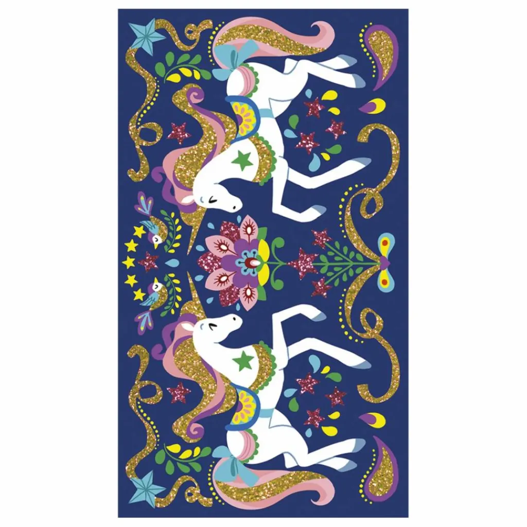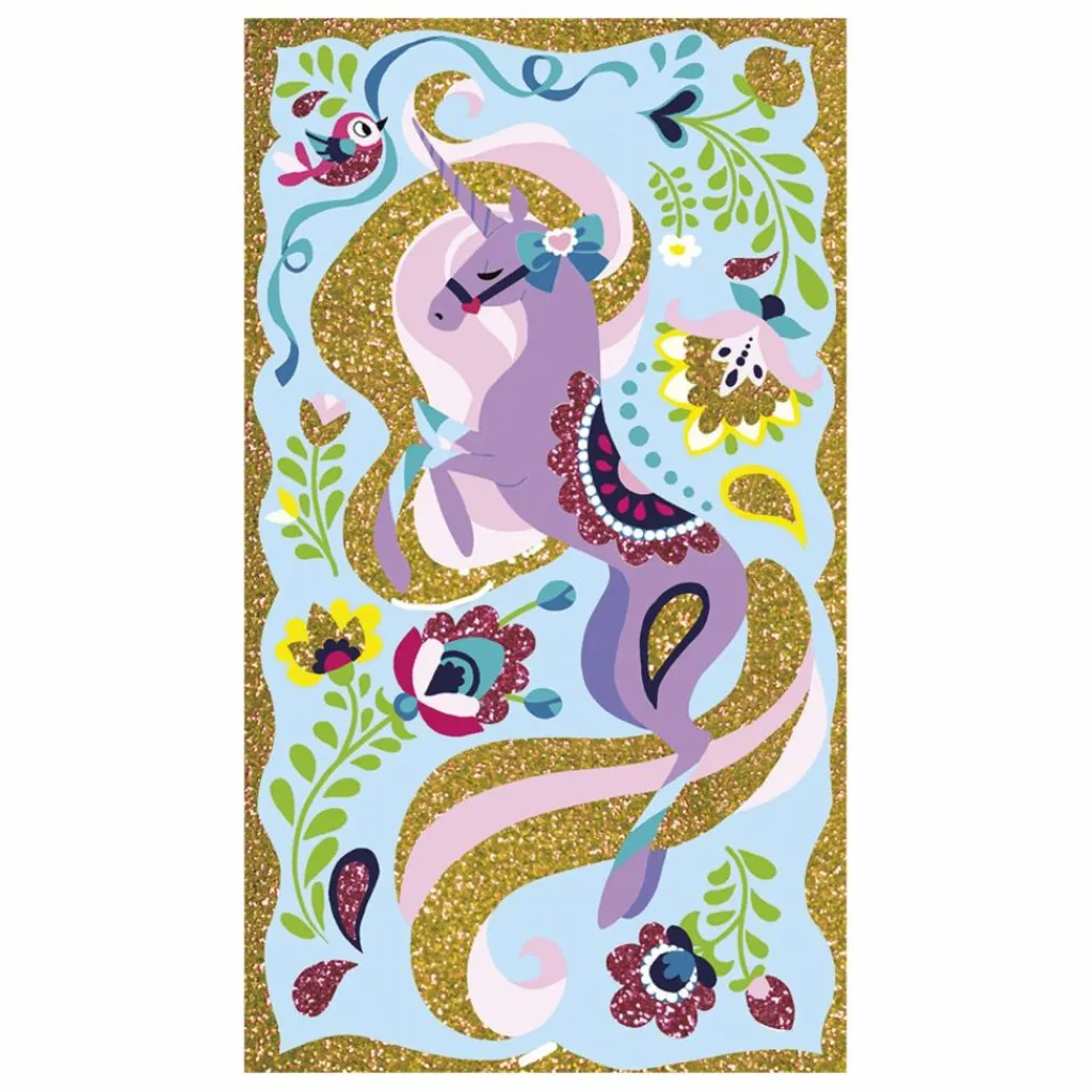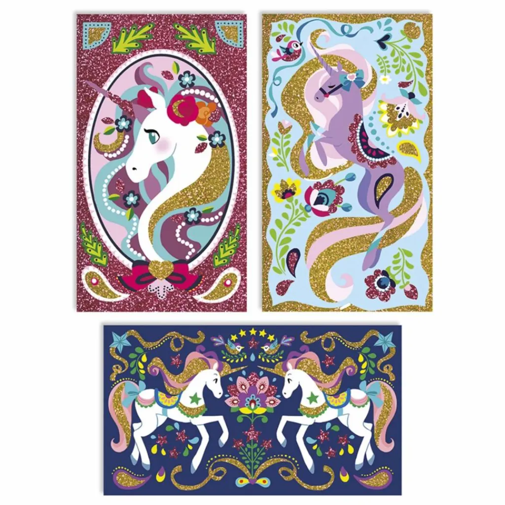 - 3 tableaux autocollants à décorer avec 2 tubes de paillettes, 1 spatule et 1 livret avec modèles avec instructions. Cette activité créative développe : la motricité, la réflexion et l’application.