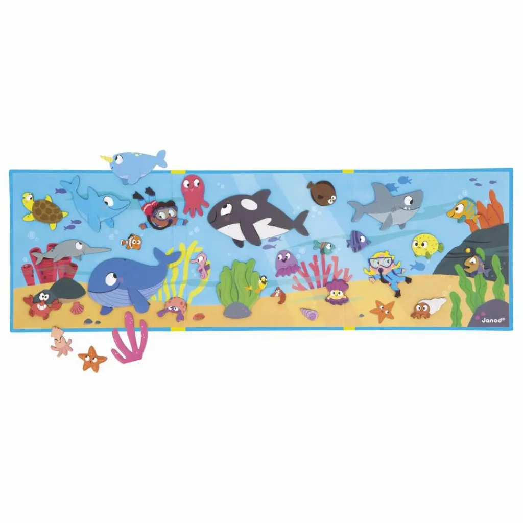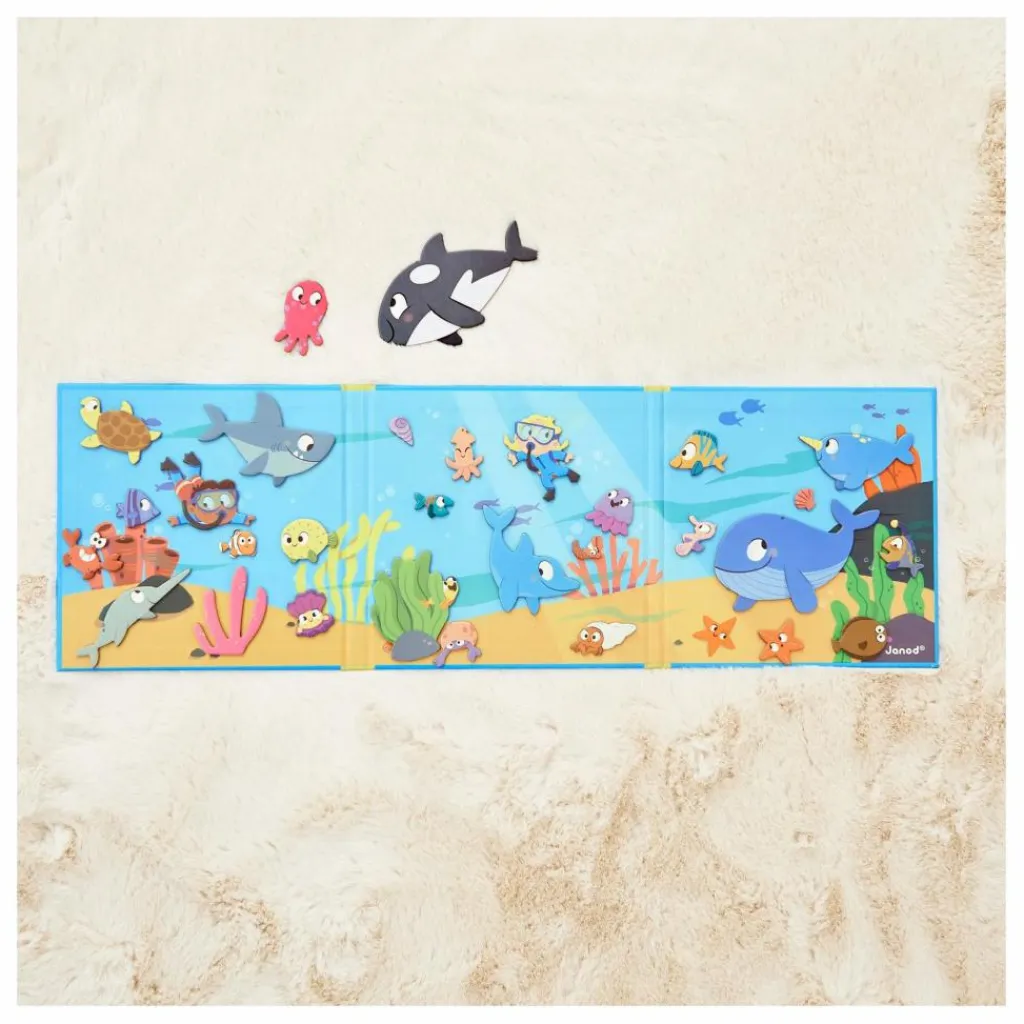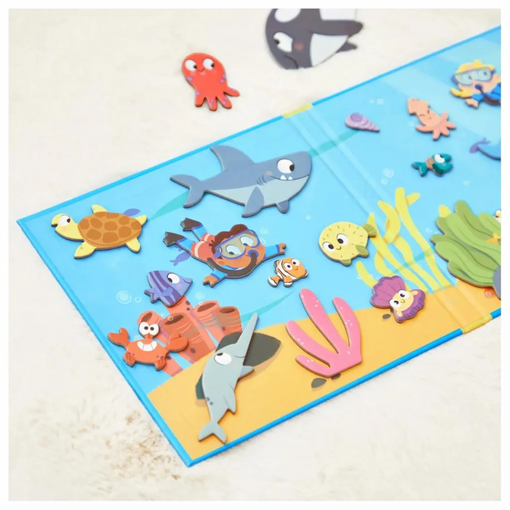 - Bienvenue dans le monde sous-marin ! Plongez à la découverte des habitants des fonds marins, du dauphin farceur à l’étoile curieuse, tous attendent votre enfant pour vivre de nouvelles aventures ! Grâce au grand décor magnétique et à ses 30 magnets représentants poissons et coquillages, votre enfant pourra imaginer pleins d’histoires dans l’univers aquatique. Jouet magnétique en carton FSCTM. Jouet pour les enfants à partir de 3 ans..