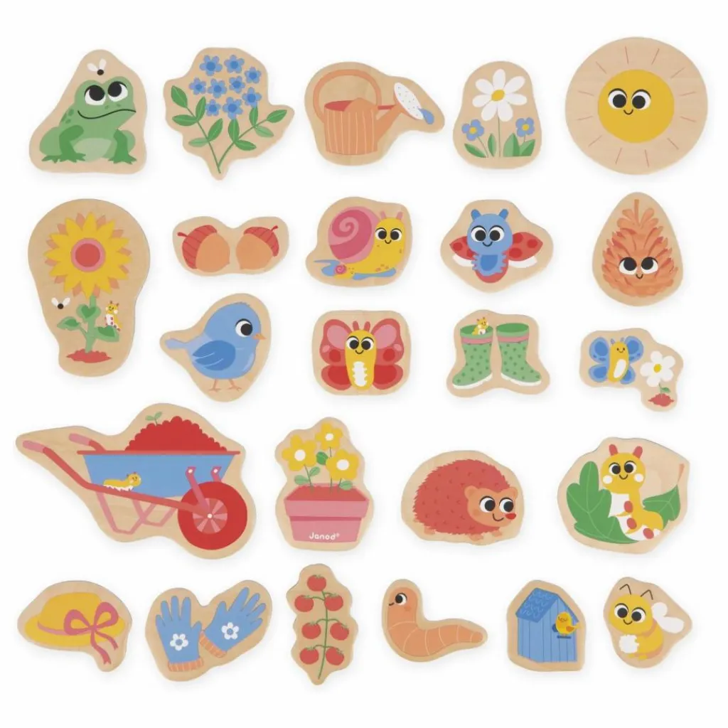 - Chaussez vos bottes et enfilez vos gants, il est temps de planter vos premiers fruits et légumes dans le jardin ! Ce set est composé de 24 magnets en bois pouvant être positionnés sur des tableaux magnétiques, ou toute autre surface aimantée. Votre enfant pourra développer son imagination et sa motricité fine tout en s’amusant. Jouet magnétique en bois FSCTM pour les enfants à partir de 2 ans.