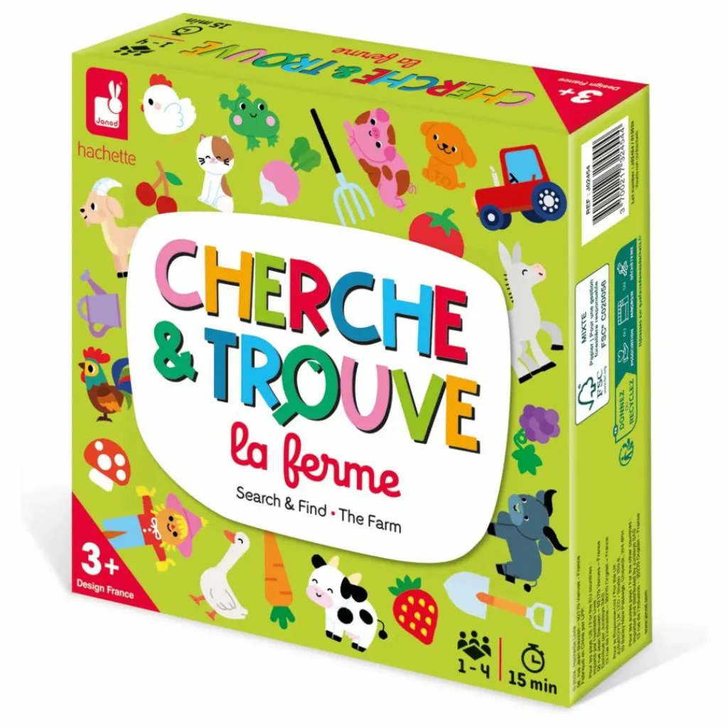 - Immersion imminente à la ferme ! Le but du jeu est de trouver tous ensemble des éléments sur les plateaux pour gagner 10 cartes. On choisit le côté blanc ou vert du plateau et on joue avec le côté des cartes de la même couleur. Le plus jeune joueur lance le dé puis il pioche une carte et la montre aux autres joueurs. C’est l’élément qu’ils doivent retrouver sur le plataeau, autant de fois que le chiffre indiqué par le dé. La carte est gagnée si le nombre d’élément à trouver est atteint. Sinon, la carte est perdue. Une variante rapido est possible: il faut gagner le maximum de cartes sur une durée de 5 minutes. Il est aussi possible de jouer en solo ! La boîte contient 1 plateau de jeu recto-verso en quatre parties, 20 cartes recto-verso, 1 dé en bois et les règles du jeu en 7 langues. Une partie « classique » dure environ 15 minutes. De 1 à 4 joueurs. Dès 3 ans.