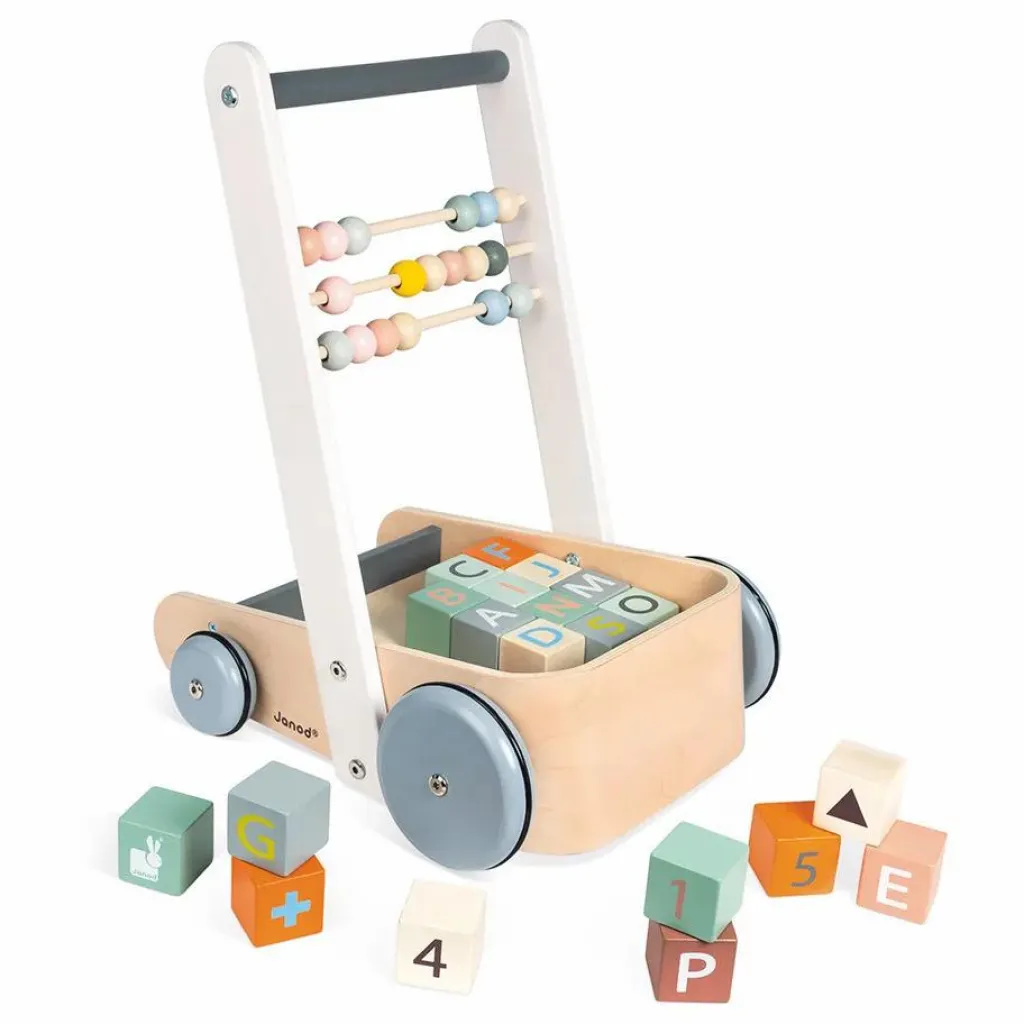 Ce chariot multi-fonction participera grandement à l’éveil de votre enfant. Que ce soit pour apprendre à marcher, pour aider au développement de sa motricité fine en manipulant le boulier ou l’apprentissage des chiffres, des lettres et des formes à l’aide des cubes en bois !