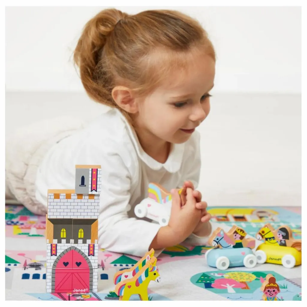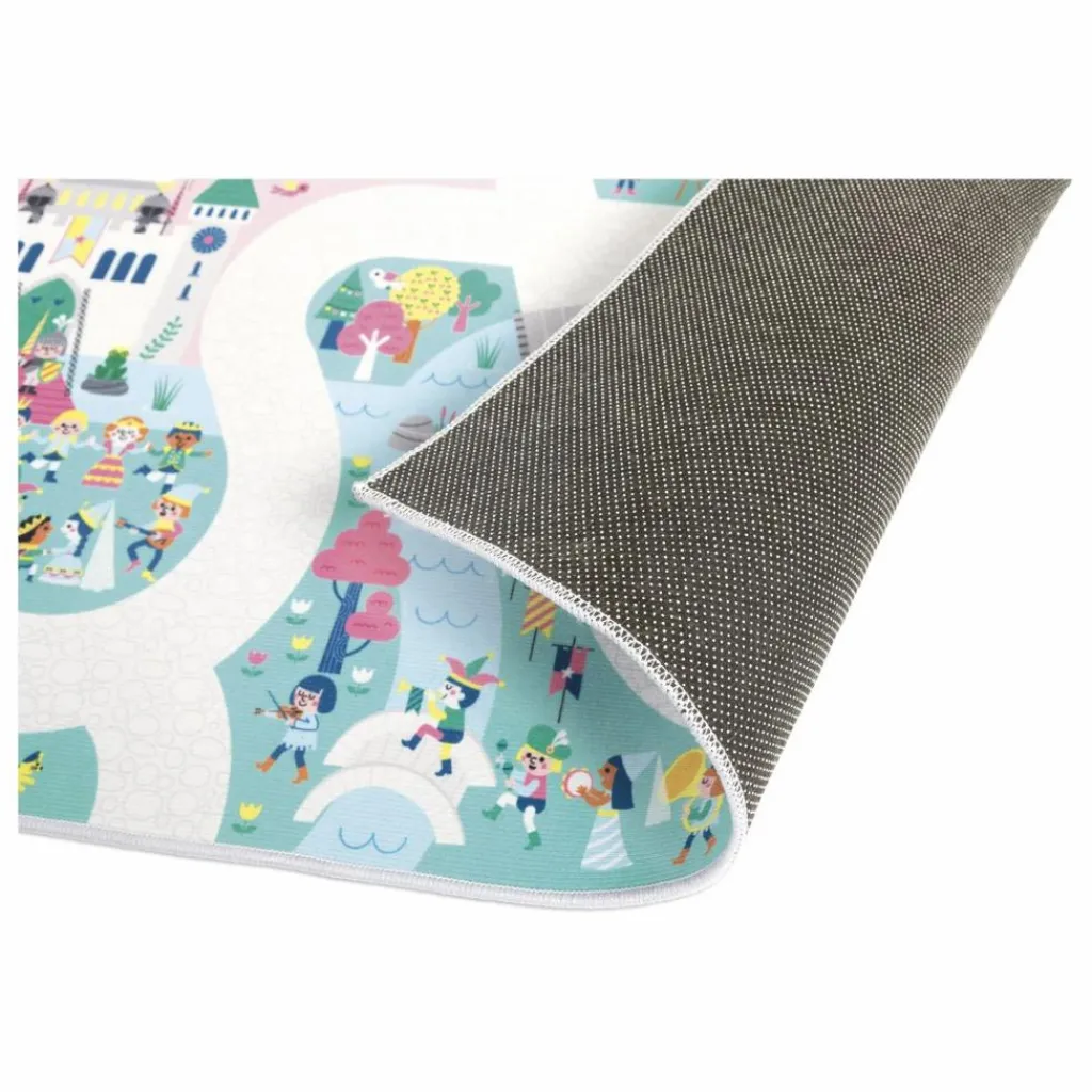 - Des licornes galopent dans la plaine rose, un sorcier prépare une potion dans la forêt, un château fort est sur le point de se faire attaquer par un dragon, pas de doute nous sommes bien au royaume enchanté ! Pour découvrir tous les recoins de ce fabuleux royaume et imaginer de nombreuses histoires il faudra parcourir le long chemin pavé. Ce tapis est idéal pour stimuler l’imagination. C’est également un cherche et trouve géant. Saurais-tu retrouver le trompettiste du roi ? Il permet aussi à l’enfant de développer son vocabulaire autour des instruments de musique, des chiffres et des émotions. Le petit plus : le tapis est anti-dérapant ! Votre enfant pourra facilement faire rouler ses petits véhicules et jouera en toute sécurité. Jouet d’imitation pour les enfants à partir de 2 ans. Ton tapis peut être complété d’une jolie panoplie de véhicules et de cubes en bois à retrouver dans la gamme Janod. Tu peux aussi l’associer aux autres tapis de la gamme pour créer un espace de jeu géant !
