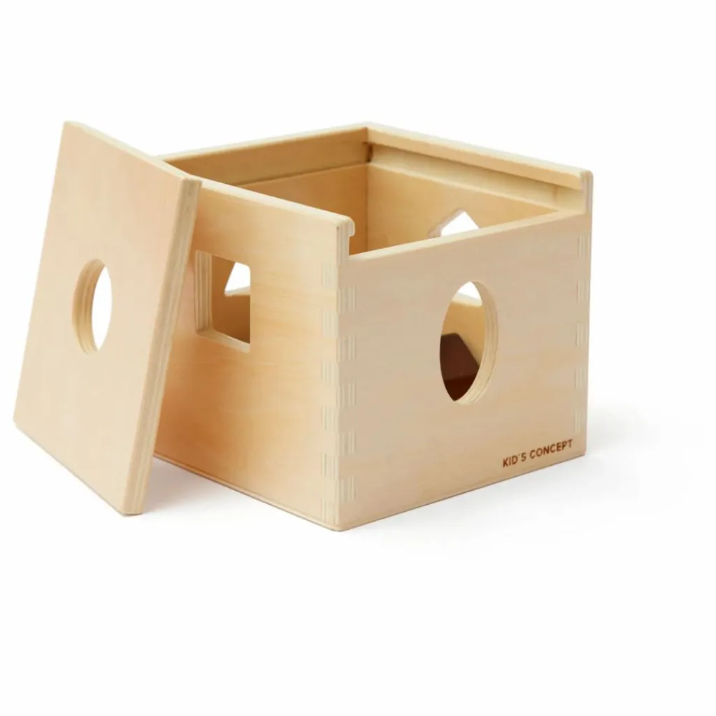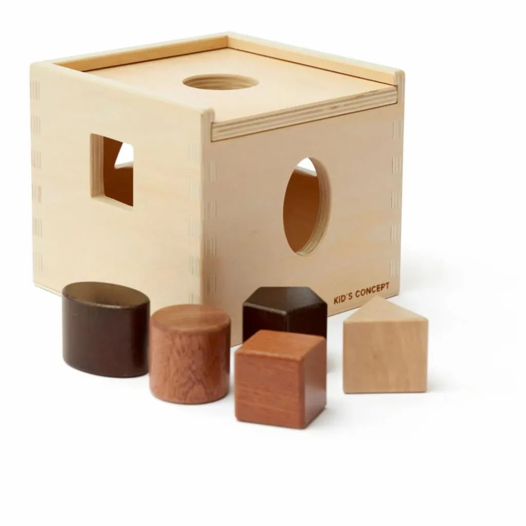 Cette boîte à formes contient cinq formes différentes en bois clair et foncé, de différentes formes, assorties à leur trou correspondant. Le couvercle coulissant se retire pour permettre de retourner la boîte pour la vider. Quand votre enfant a placé toutes les formes dans la boîte, il suffit d’ouvrir le couvercle pour recommencer.