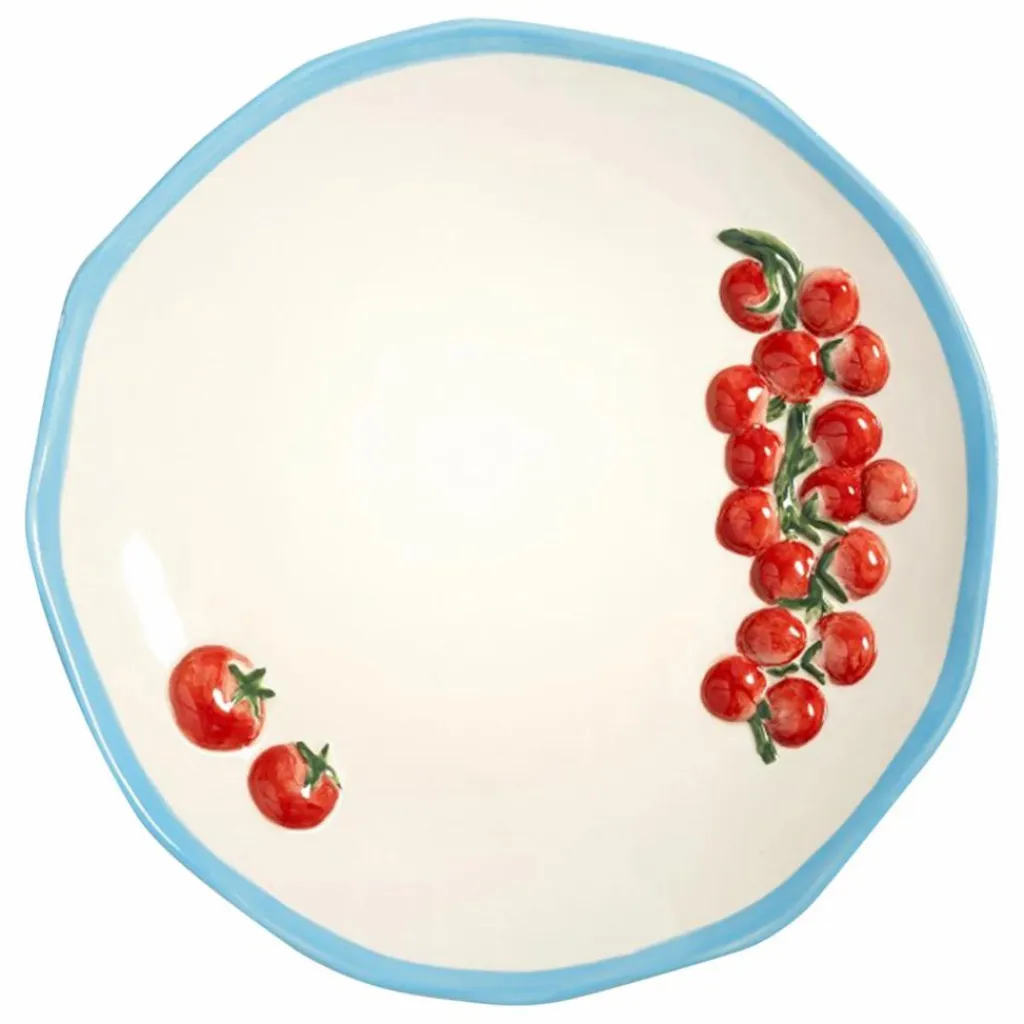 - Cette assiette de service est fabriquée avec soin en céramique, offrant un charme rustique qui la rend idéale pour un usage quotidien. Ce qui distingue vraiment cette assiette, c’est son élément décoratif – un design subtil représentant des tomates en grappe, magnifiquement intégré dans l’artisanat. Parfaite pour présenter une variété de plats, des salades fraîches aux antipasti, cette pièce allie fonctionnalité et flair artistique.