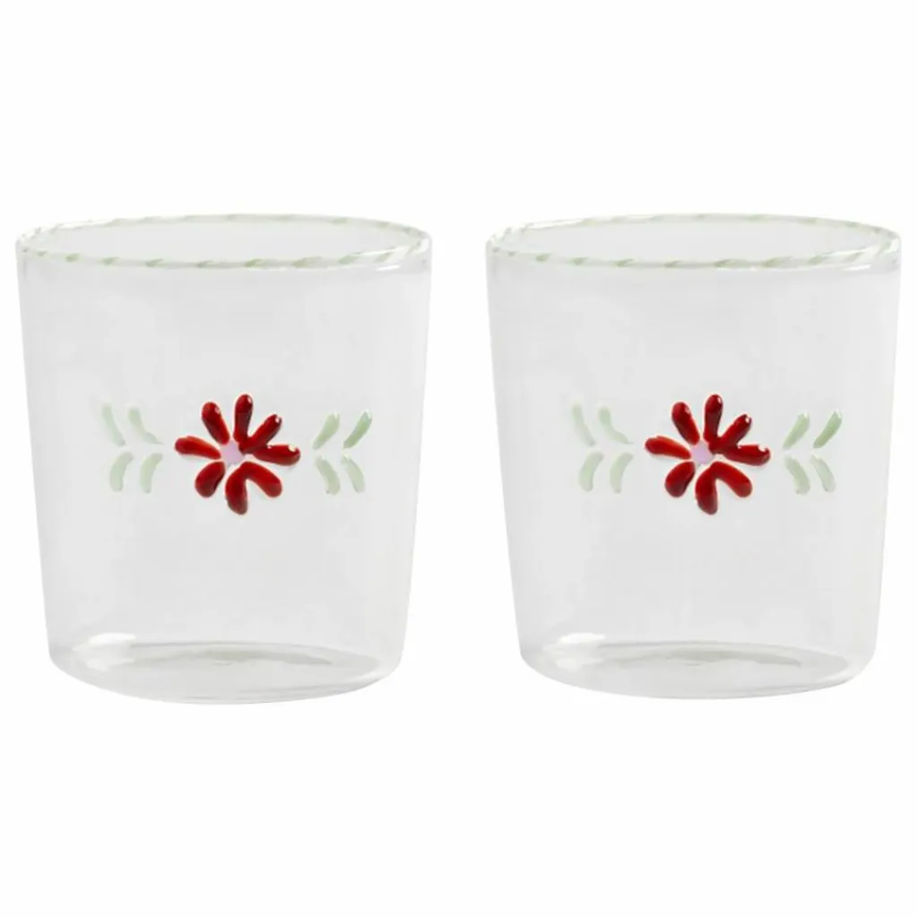 - Voici les verres à eau Flora, fabriqués en verre borosilicate durable et ornés de fleurs et de feuilles placées à la main, inspirées des motifs folkloriques scandinaves. Chaque verre présente une touche unique, littéralement, avec deux couleurs qui se fondent en une seule sur le bord. Ce set de deux est aussi fonctionnel qu’il est frappant, et est livré soigneusement emballé dans la boîte signée &k.