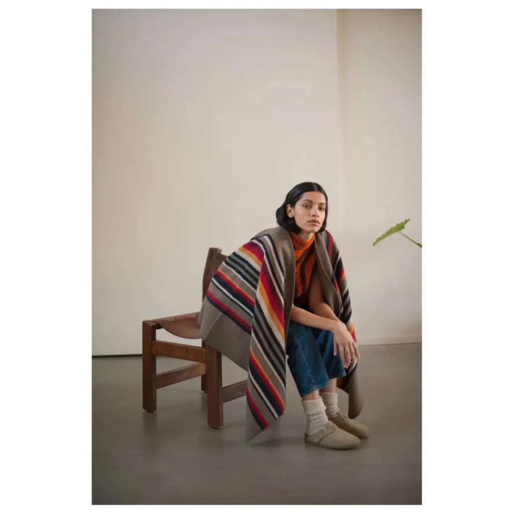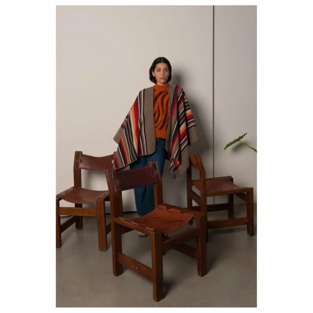 - Cette pièce est inspirée d’un poncho, est tissée en laine douce, une matière au toucher unique.