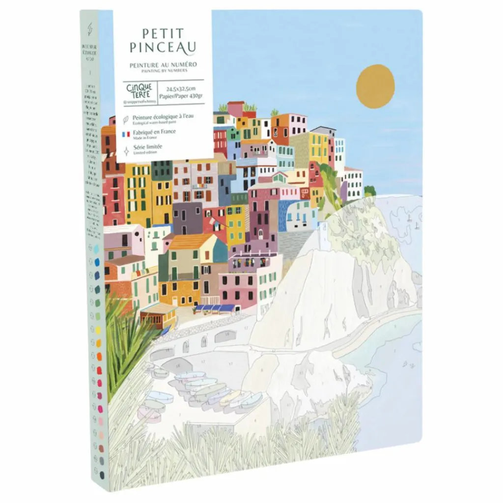 - 1 illustration à peindre format 24,5 x 32,5 cm avec papier 350g, 2 pinceaux, pots de peinture, 1 planche de stickers numérotés à coller sur chaque petit pot de peinture, 1 notice qui contient un descriptif des composants, des conseils