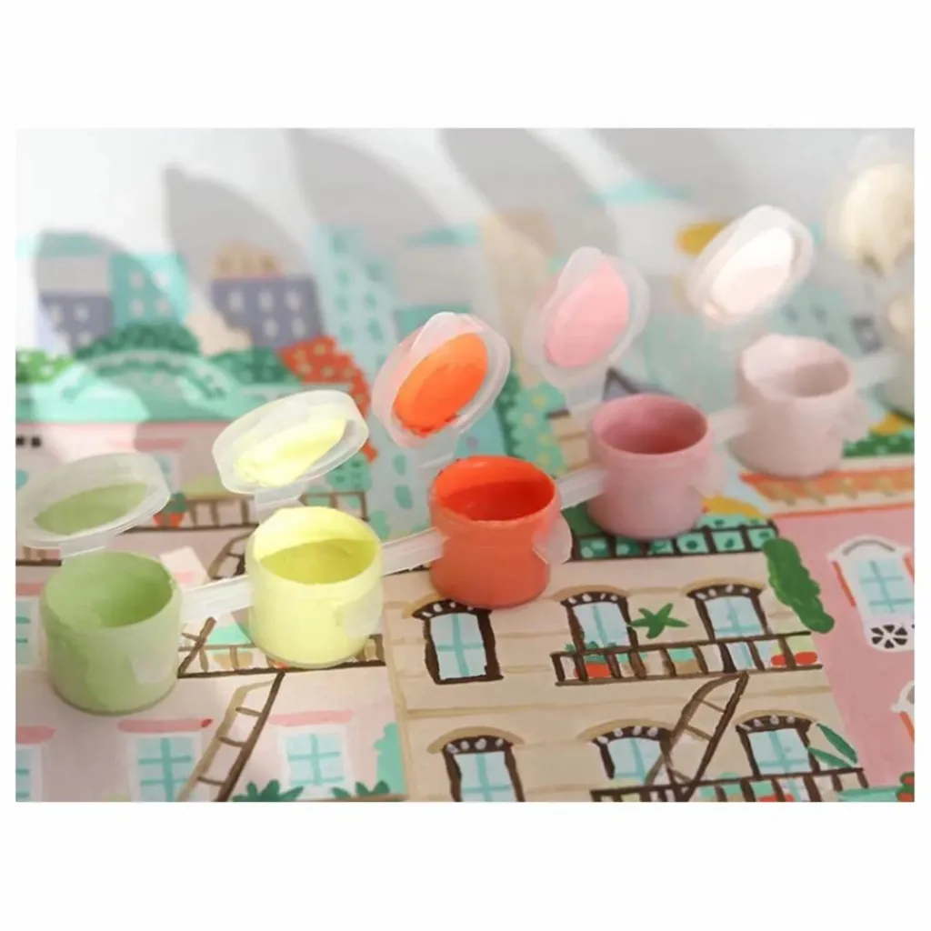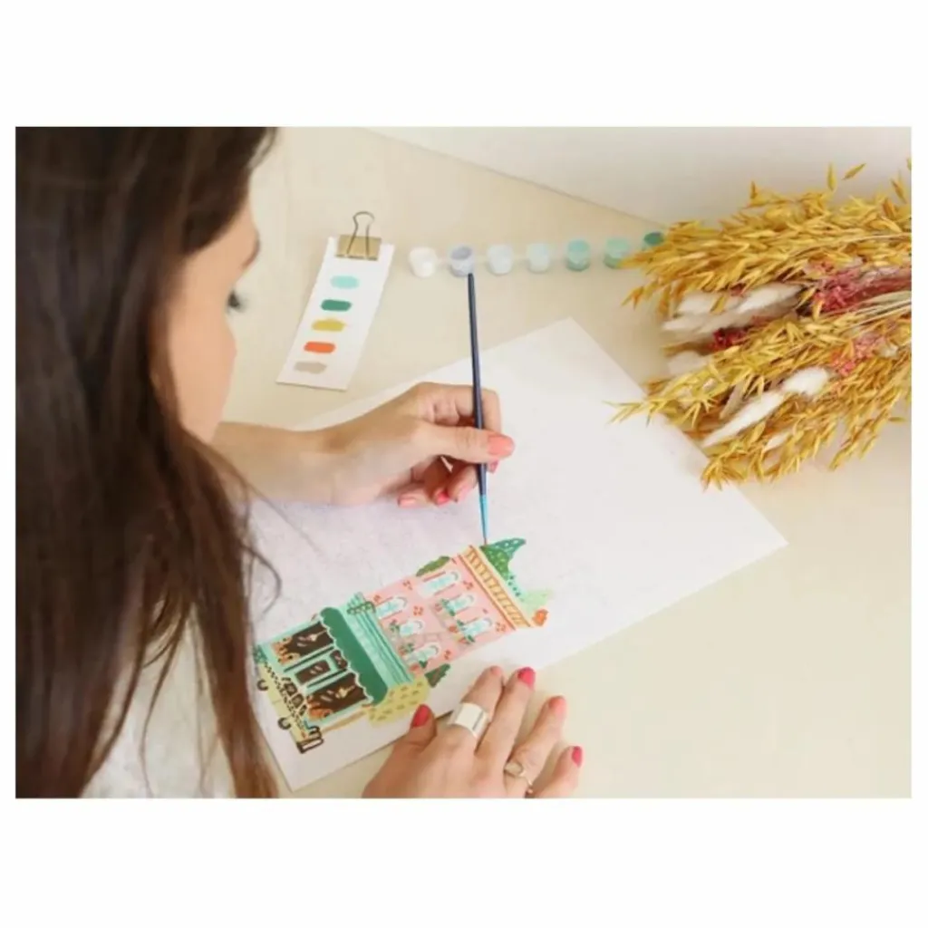 - 1 illustration à peindre format 24,5 x 32,5 cm avec papier 350g, 2 pinceaux, pots de peinture, 1 planche de stickers numérotés à coller sur chaque petit pot de peinture, 1 notice qui contient un descriptif des composants, des conseils