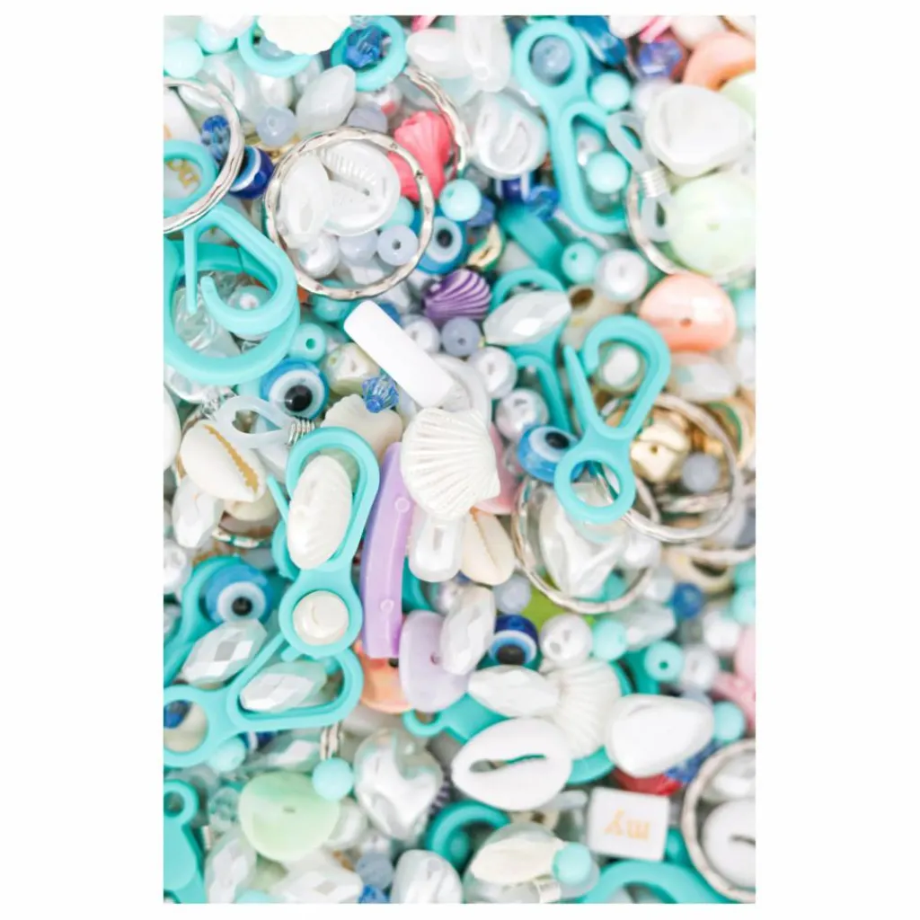 - 1 bobine de fil élastique de 10 mètres, mix de perles, accessoires divers : cordon à lunettes, fermoir mousqueton etc