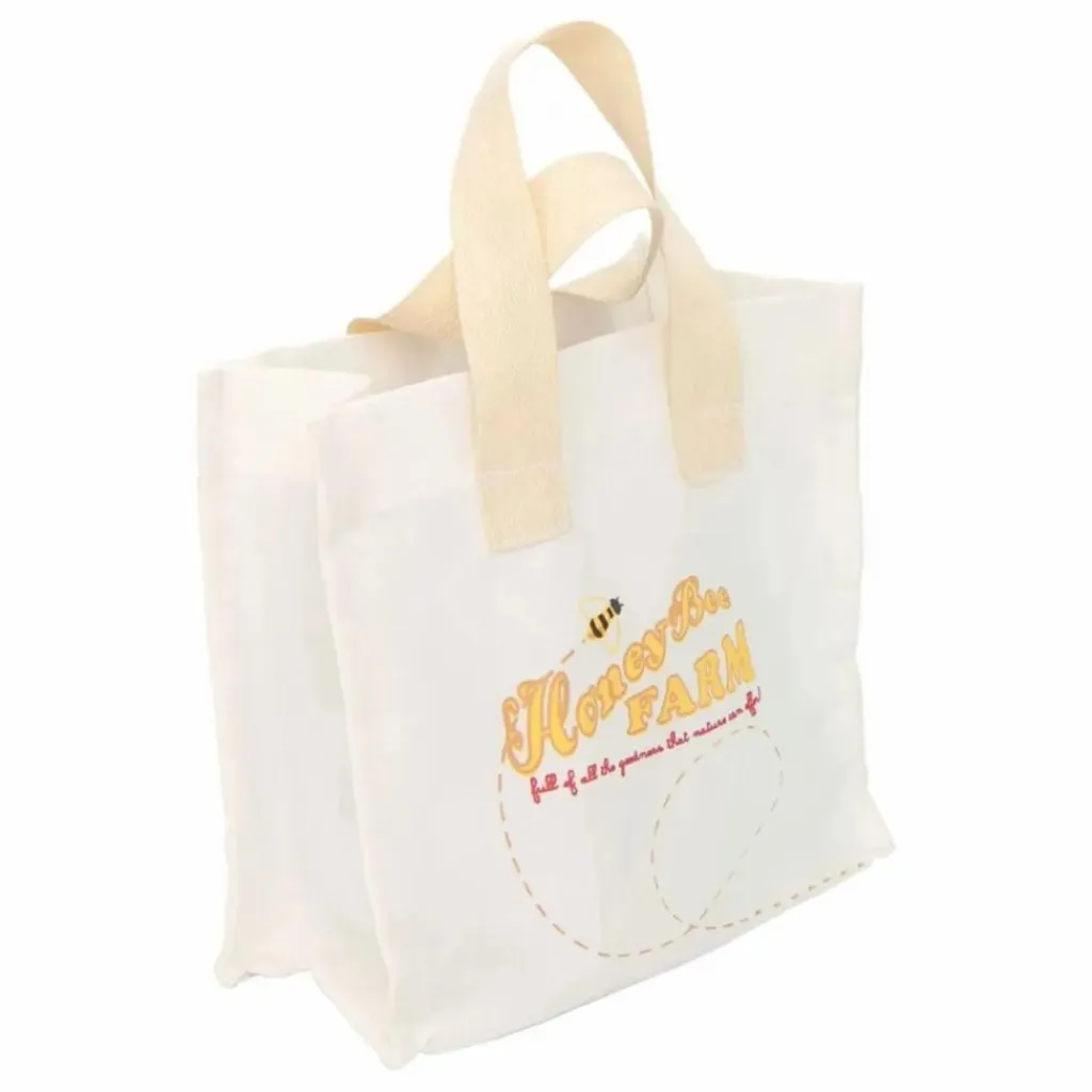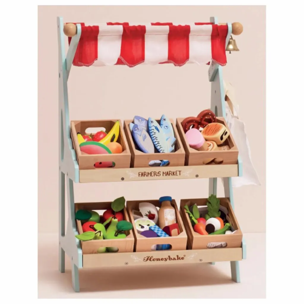- 1 marchande honeybake, 1 sac de courses en tissu, 1 cloche que les clients peuvent sonner pour attirer l’attention, 1 cagette de fruits avec papier journal, 4 pommes, 2 poires