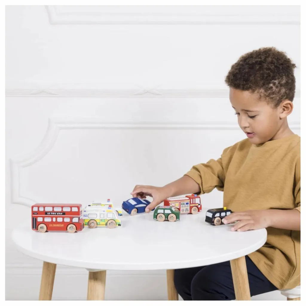 - 7 véhicules emblématiques de Londres : 1 bus à deux étages, 1 taxi noir, 1 camion de pompiers, 1 camionnette de police, 1 ambulance, 2 voitures de sport