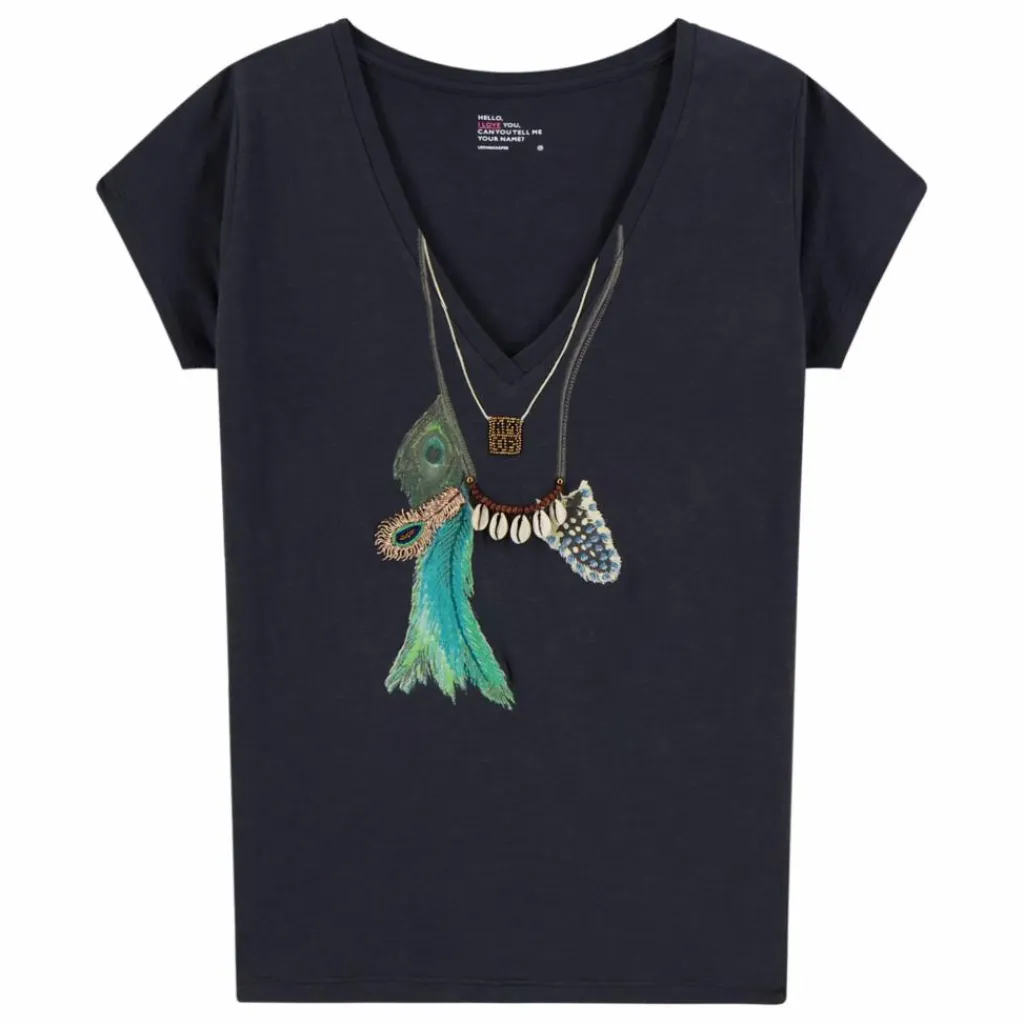 - Un brin bohème, un brin espiègle, le t-shirt Tonton Feather joue l’illusion avec son imprimé collier parsemé de plumes et de coquillages. Son col V délicatement échancré et sa coupe fluide en font une pièce légère et facile à porter, idéale pour insuffler une touche d’évasion aux looks du quotidien.