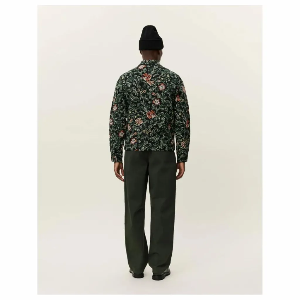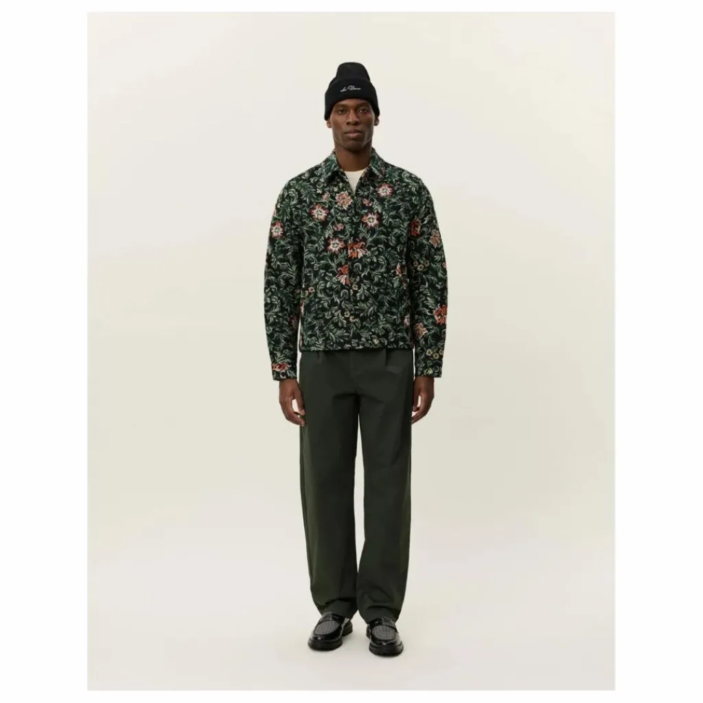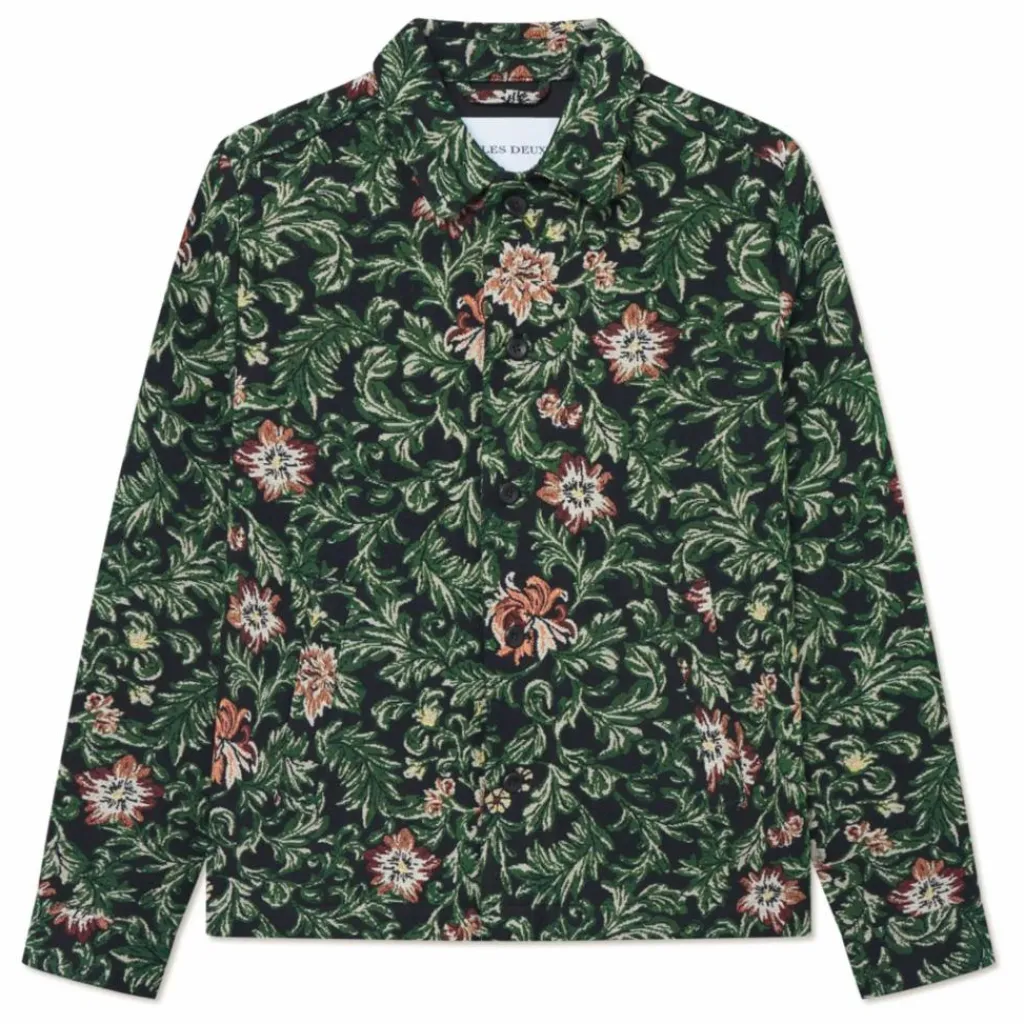 - Surchemise de style moderne en tissu jacquard fleuri structuré, avec poches violettes et col classique.