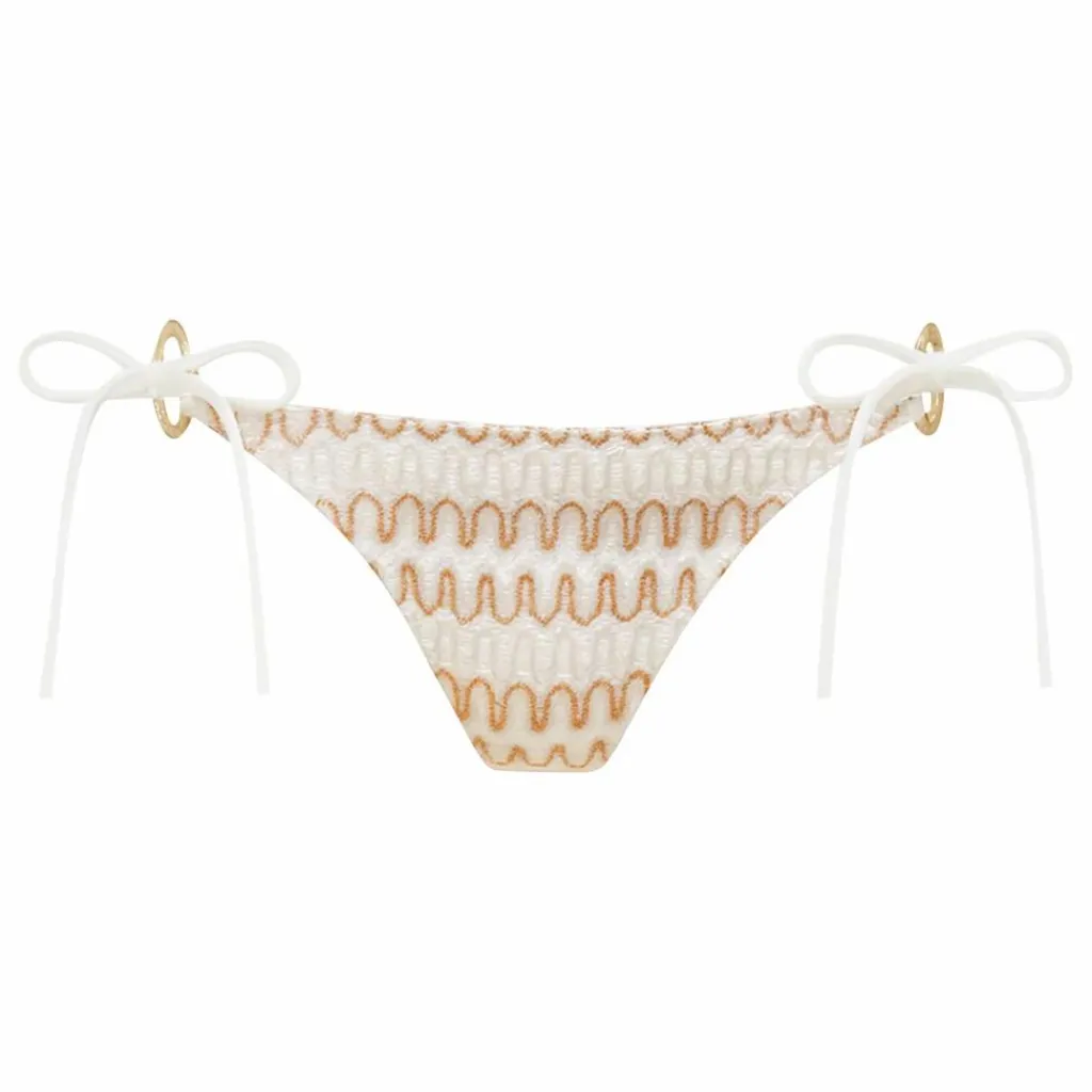 - Bas de maillot en crochet blanc avec anneaux dorés et liens à nouer ornés de bijoux. Coupe flatteuse et ajustable, entre raffinement et look couture.